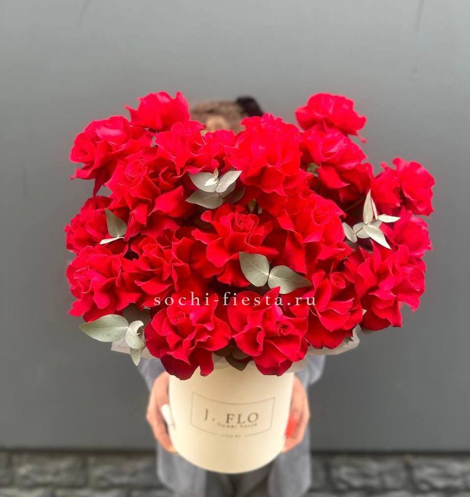 Пятнадцать вывернутых роз Джумилия раскрывают свою многослойную структуру в каждом бутоне. Эвкалипт обрамляет композицию, подчёркивая фактуру лепестков.