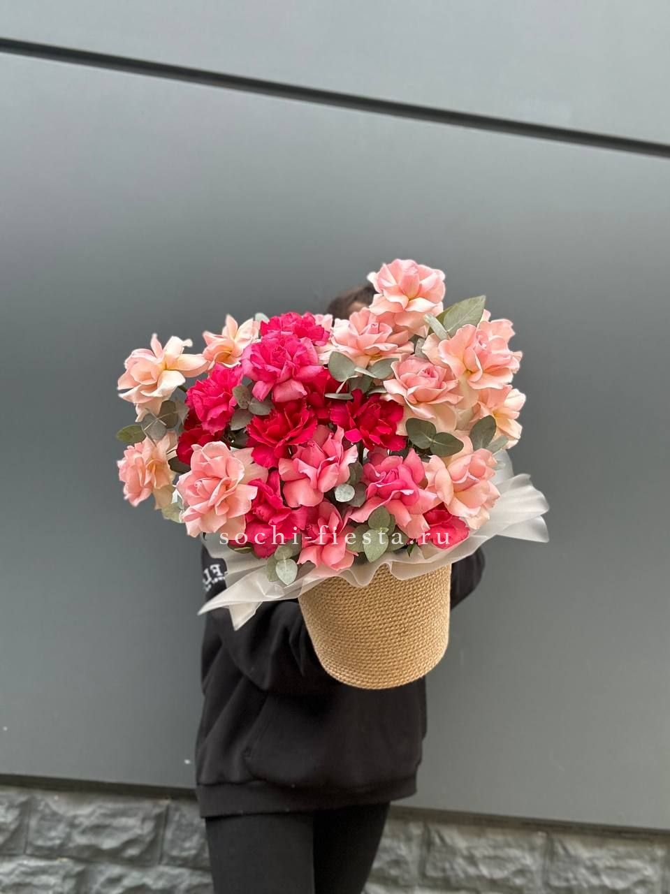 Двадцать три вывернутые розы собраны в плотную форму без дополнительного декора. Натуральное джутовое кашпо подчёркивает чистоту линий и объём бутонов.