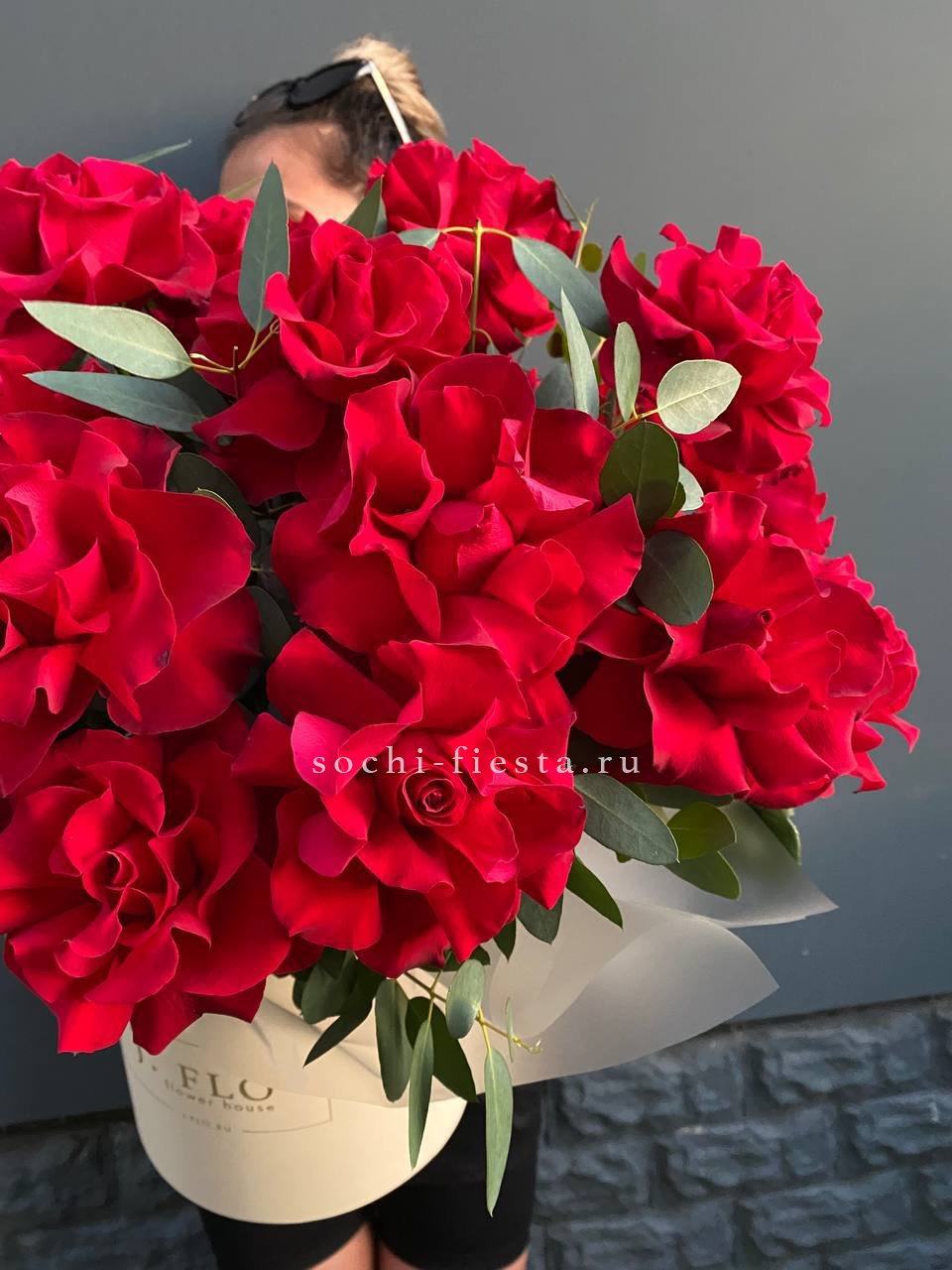 Насыщенный алый цвет роз традиционно ассоциируется с глубокой страстью, сильной любовью и восхищением. Такой подарок несет в себе мощный эмоциональный посыл и предназначен для создания драматического и торжественного эффекта.