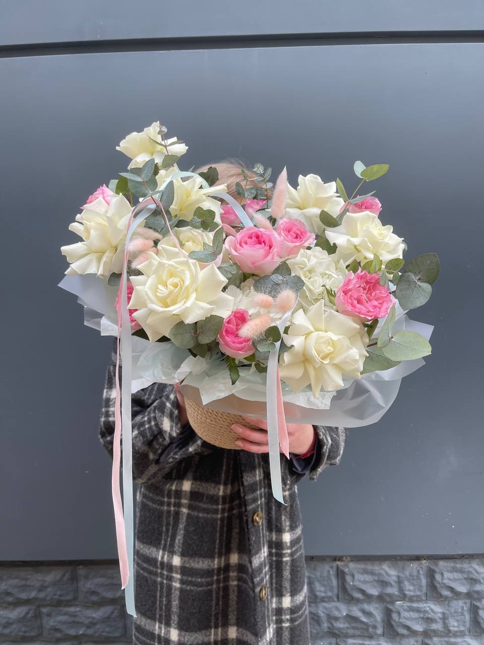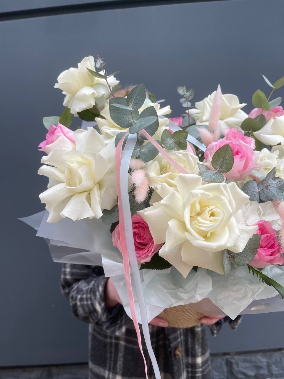 вывернутые розы, цилиндр D13, эвкалипт, лента, упаковка.