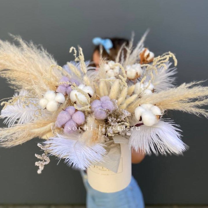 Форматы — моно-букет, авторский микс с эвкалиптом и лавандой, шляпная коробка, корзина с флористической губкой, композиция в стеклянной вазе. Габариты и плотность подбираются под повод и размер помещения.