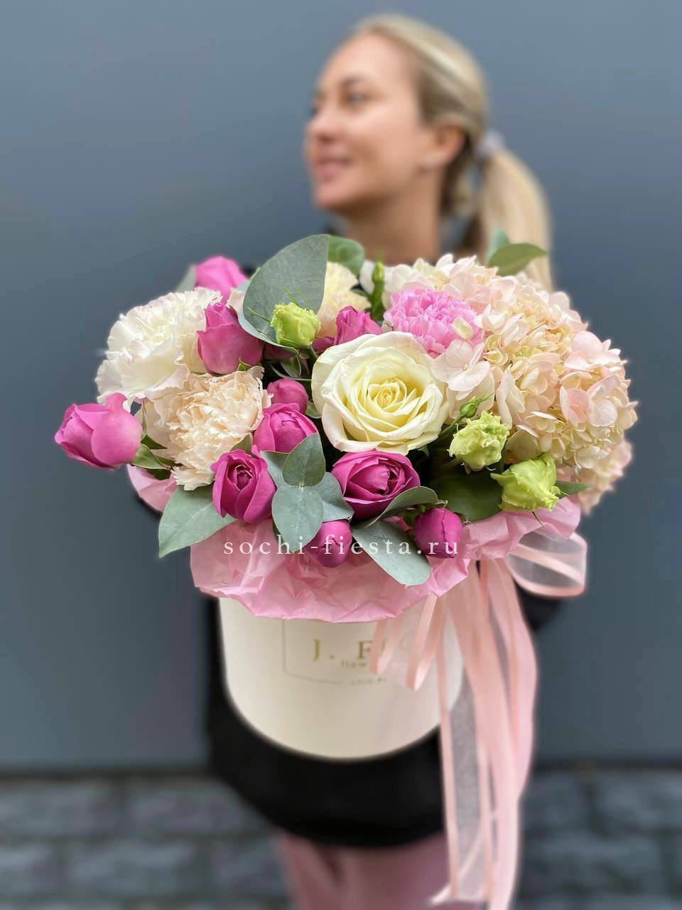 Гортензия и пионовидные розы создают густую округлую форму с мягкими переходами оттенков. Диантус добавляет воздушные вкрапления между крупными бутонами. Композиция в сумке-кашпо держит силуэт и выглядит цельно.