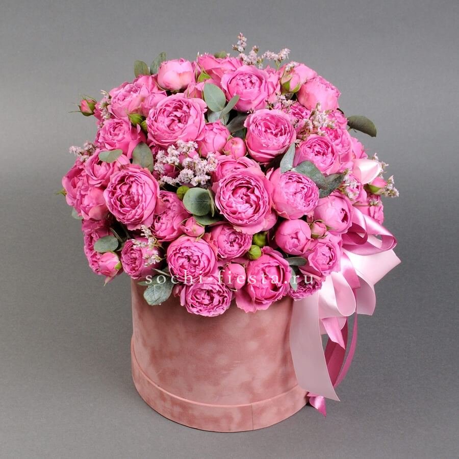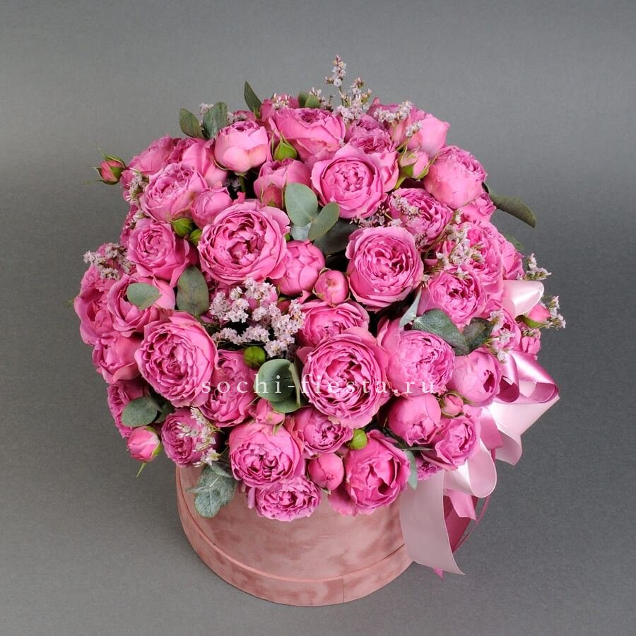гортензия, розовые розы, пионовидные розы, диантус, эвкалипт, лента, сумка-кашпо.