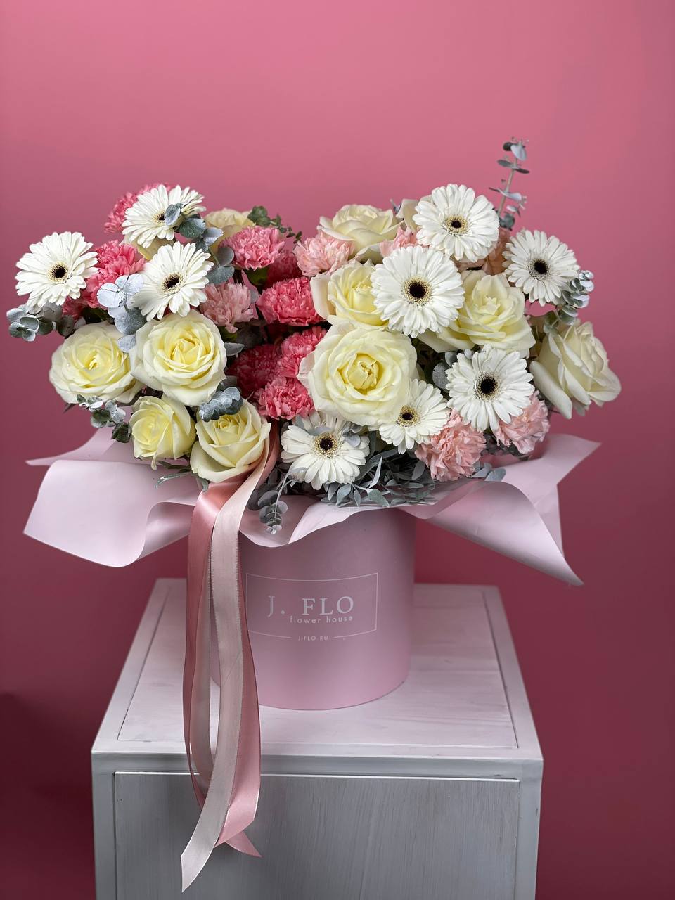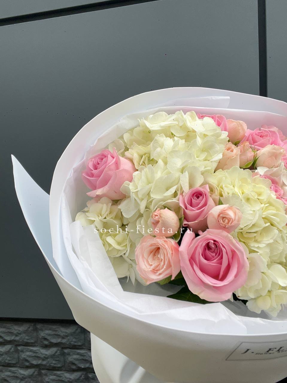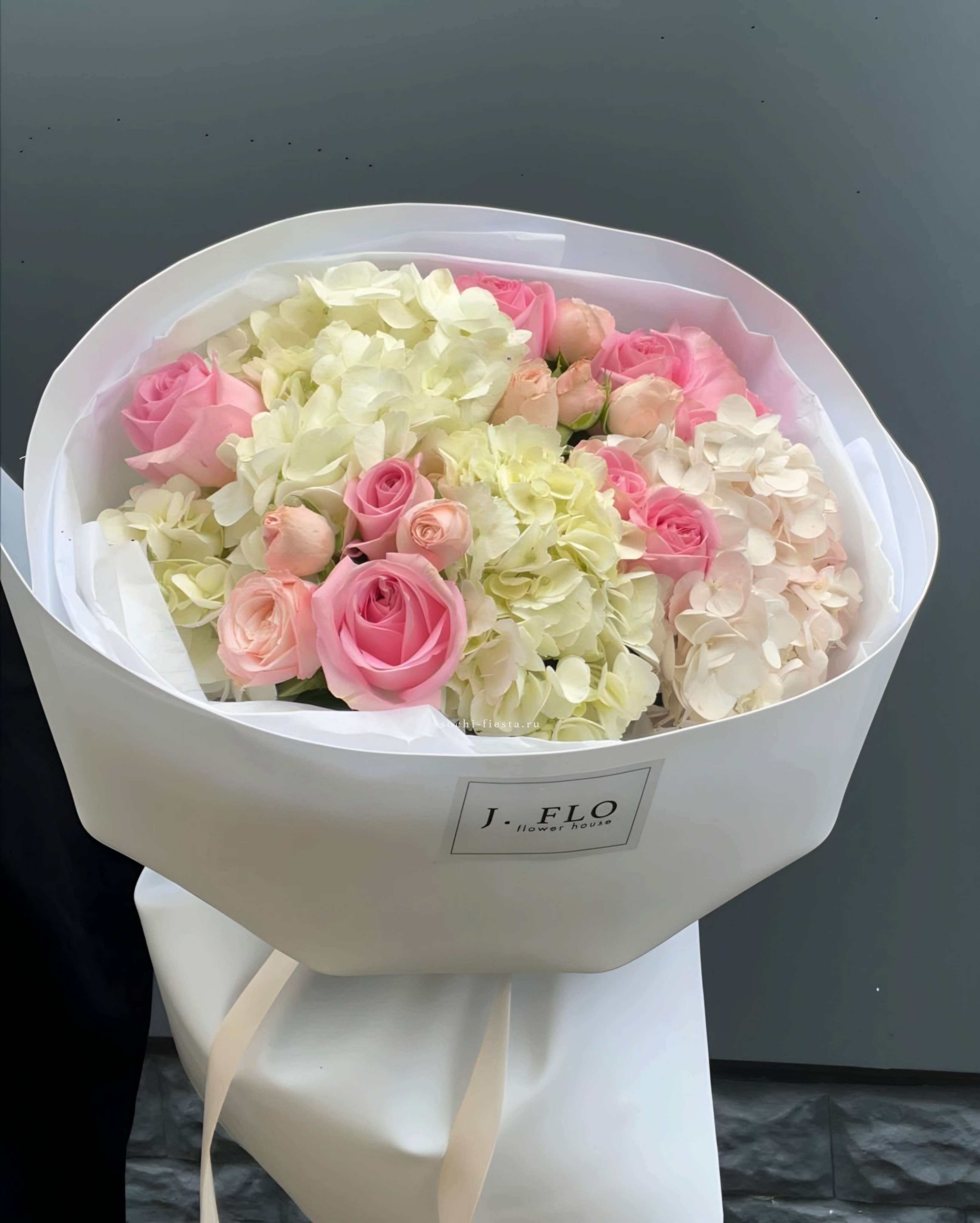 гортензия, вывернутые розы, диантус, кустовая роза, диантусы, оформление в боксе.