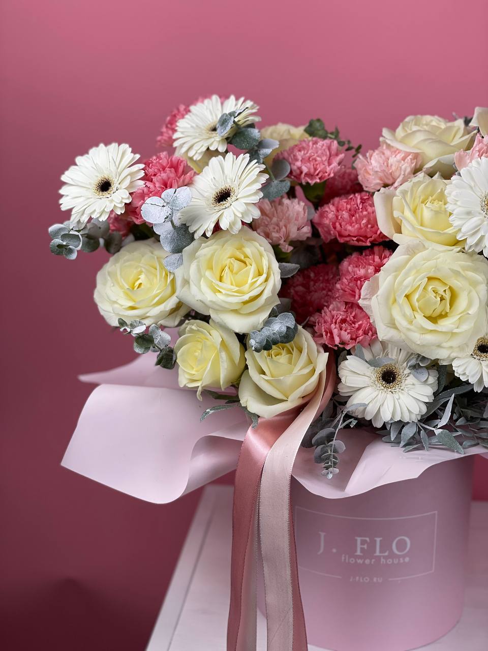 Вывернутые розы раскрывают пышную внутреннюю структуру лепестков и задают фактурный ритм композиции. Гортензия и диантусы дополняют объём воздушными соцветиями в лаконичном боксе.