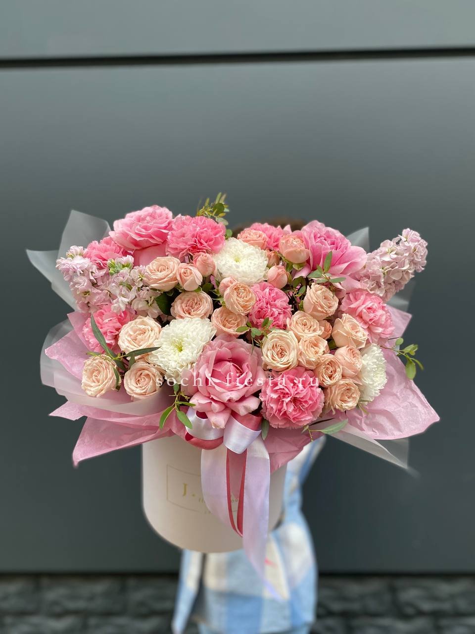 Настоящий цветочный фейерверк в стильной коробке! Эта пышная и многосоставная композиция притягивает взгляды богатством форм и оттенков — от кремового и персикового до насыщенного розового и белого. Это не просто цветы, а целая история о радости, празднике и восхищении. Подарок, который гарантированно произведет яркое впечатление и останется в памяти надолго.