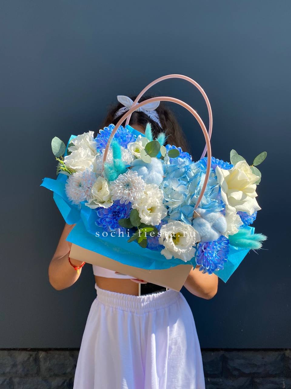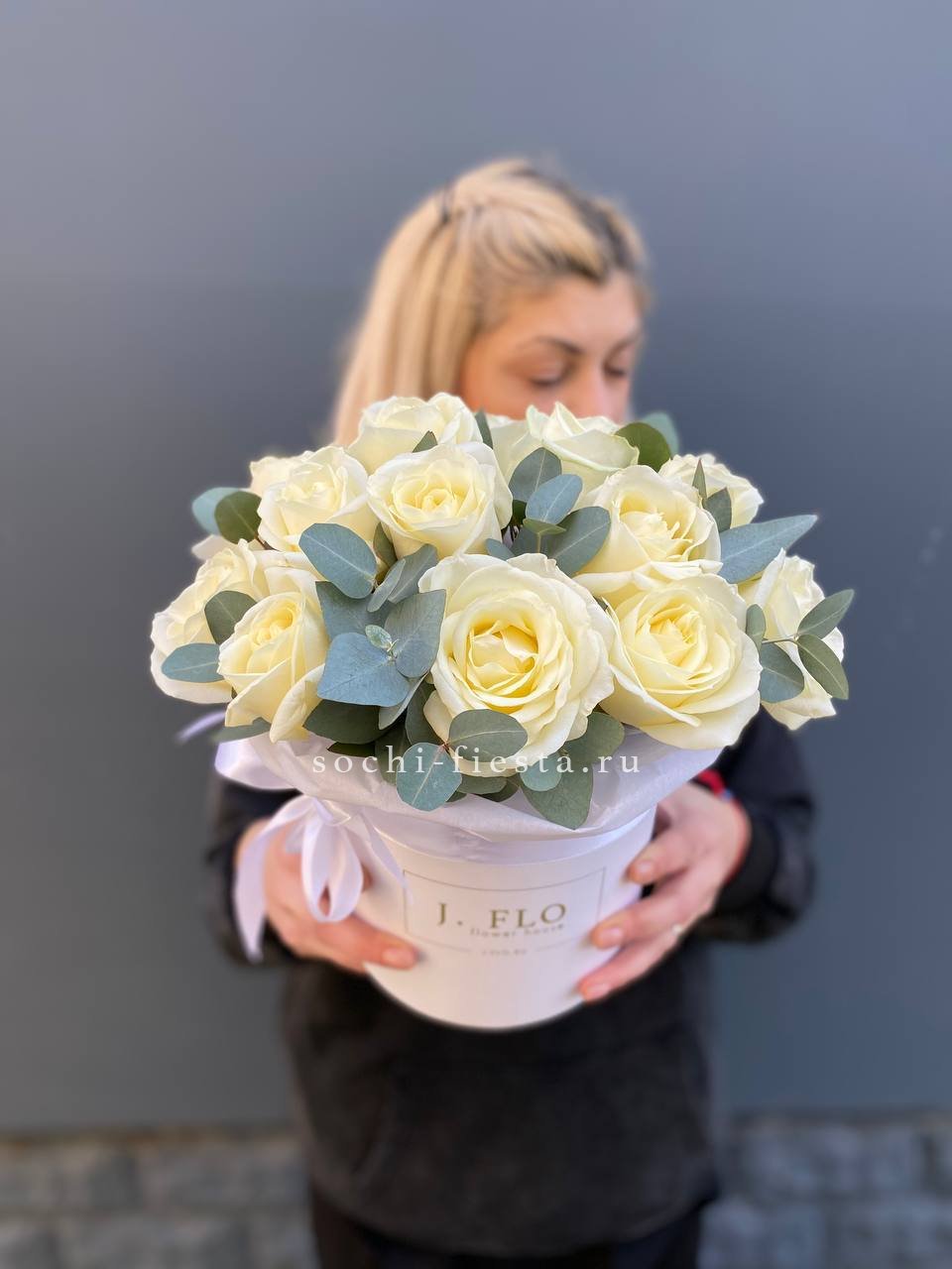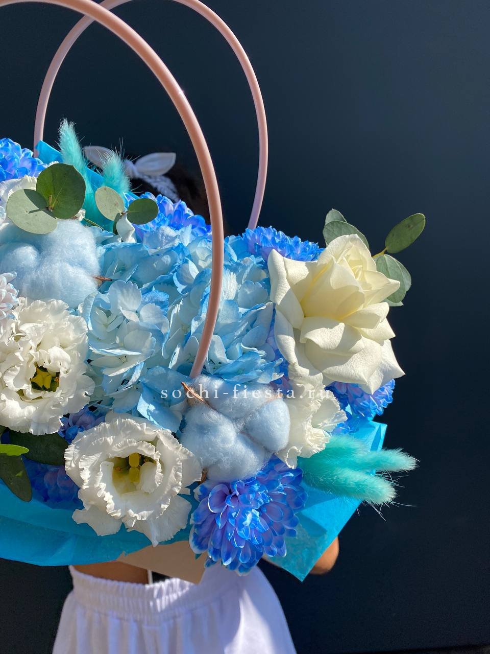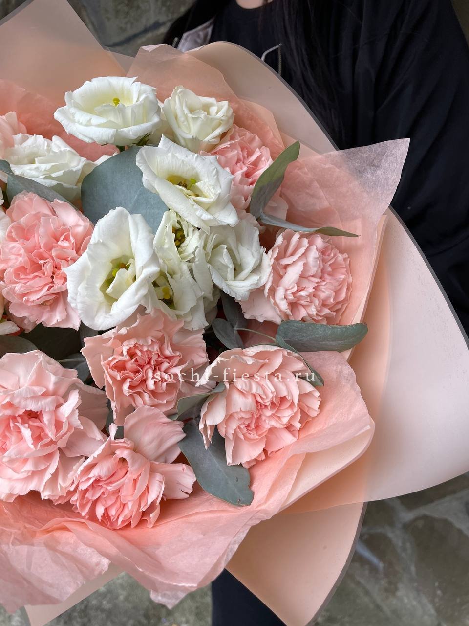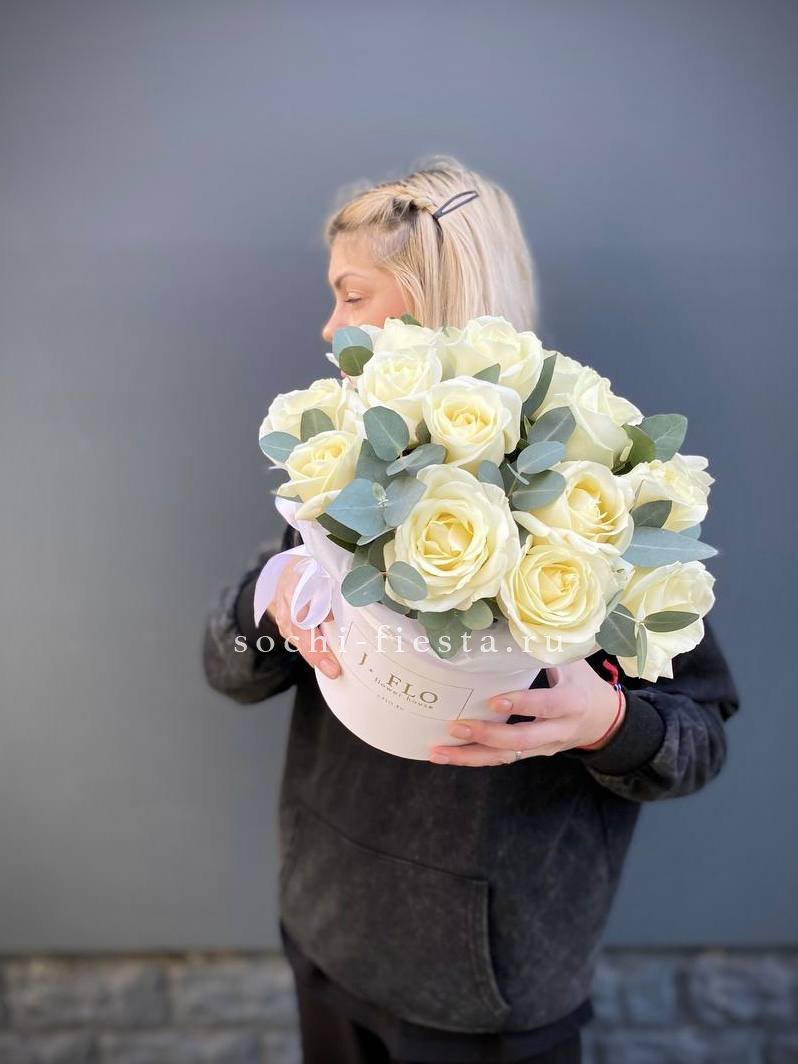 Белоснежные диантусы с пышными лепестками держат форму и долго сохраняют свежесть. Серебристый эвкалипт разбавляет плотность бутонов и добавляет прохладные нотки в композицию.