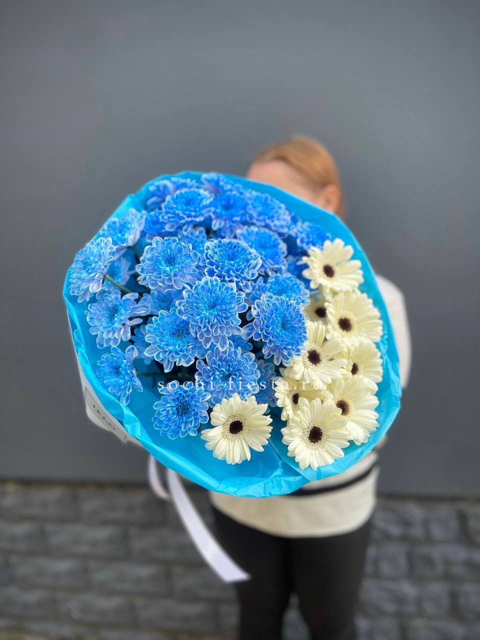 хризантемы, герберы, упаковка, лента.