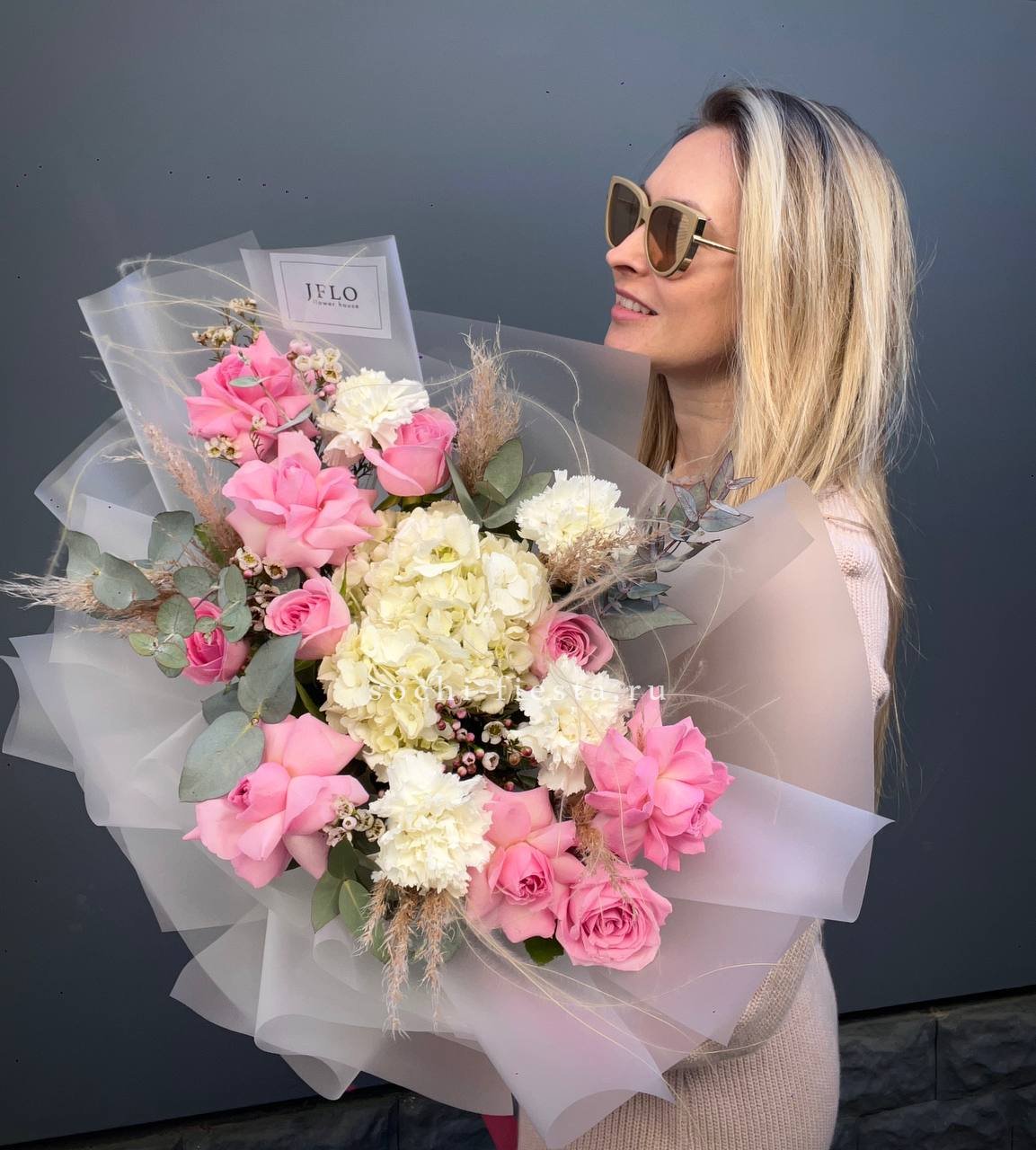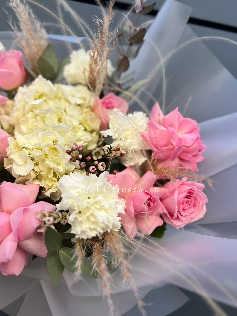 Актуальный и модный букет в трендовой палитре. Сочетание нежно-розовых и белых оттенков с матовой упаковкой отвечает последним тенденциям флористики. Легкость, воздушность и тщательно подобранный состав делают эту композицию идеальным выбором для стильной девушки или современного торжества. Безупречный вкус в каждой детали.