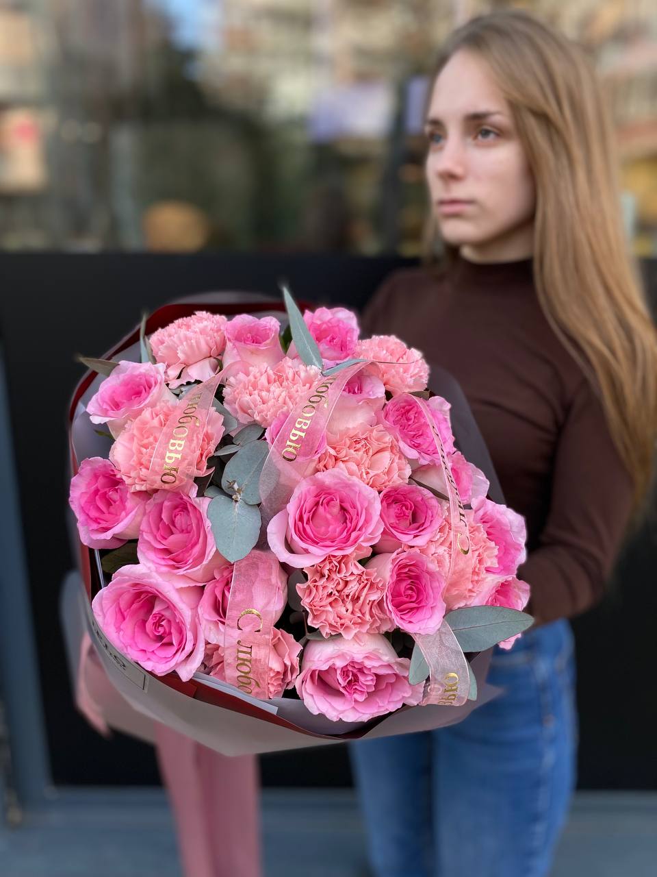 Розовые розы собраны плотной полусферой, где каждый бутон раскрывается навстречу свету. Диантусы добавляют воздушности, а эвкалипт мягко обрамляет композицию. Букет, который говорит без слов.
