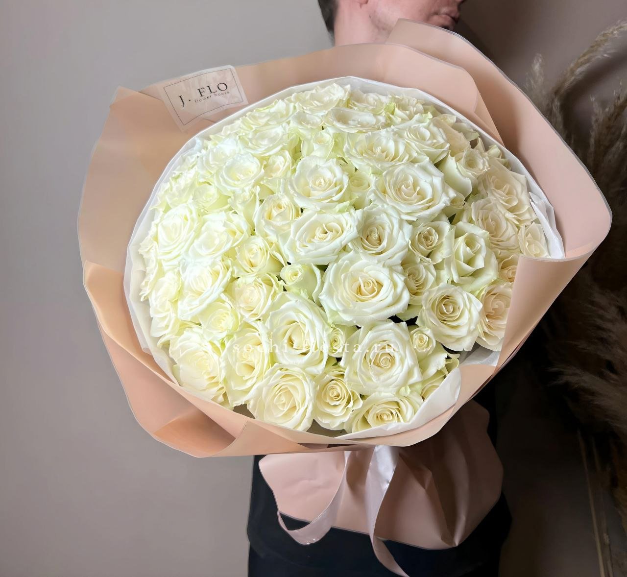 Сто один стебель белоснежной эустомы с многоярусными бутонами собраны в воздушный букет. Каждый цветок напоминает миниатюрную розу и вместе они образуют лёгкую скульптурную форму.