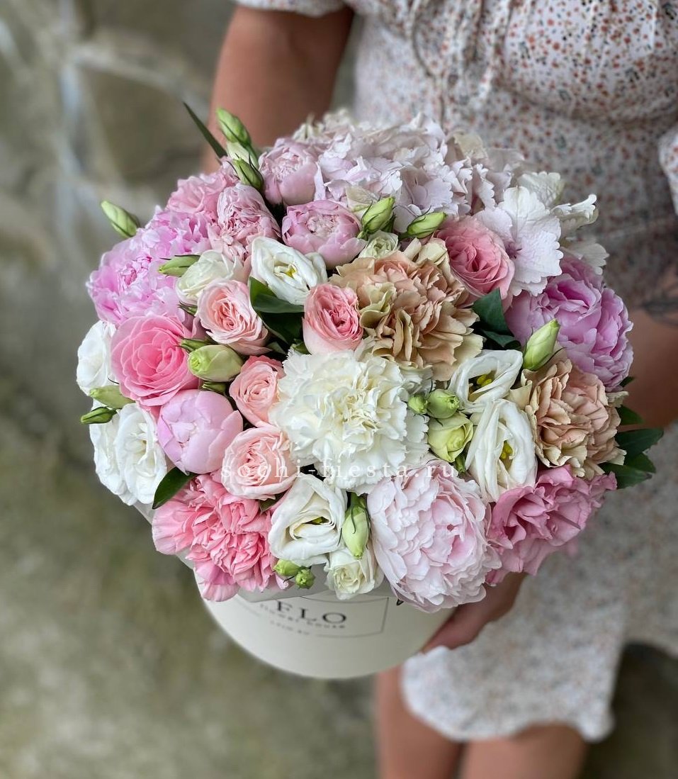 гортензия, герберы, розы французские, эустомы, эвкалипт, оазис, шляпная коробка, пленка, лента.