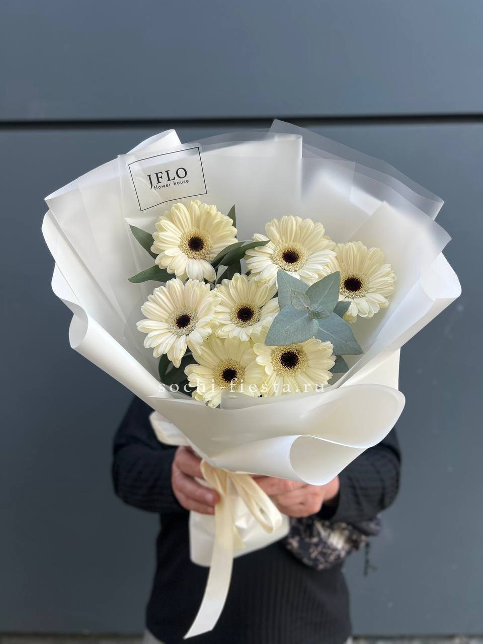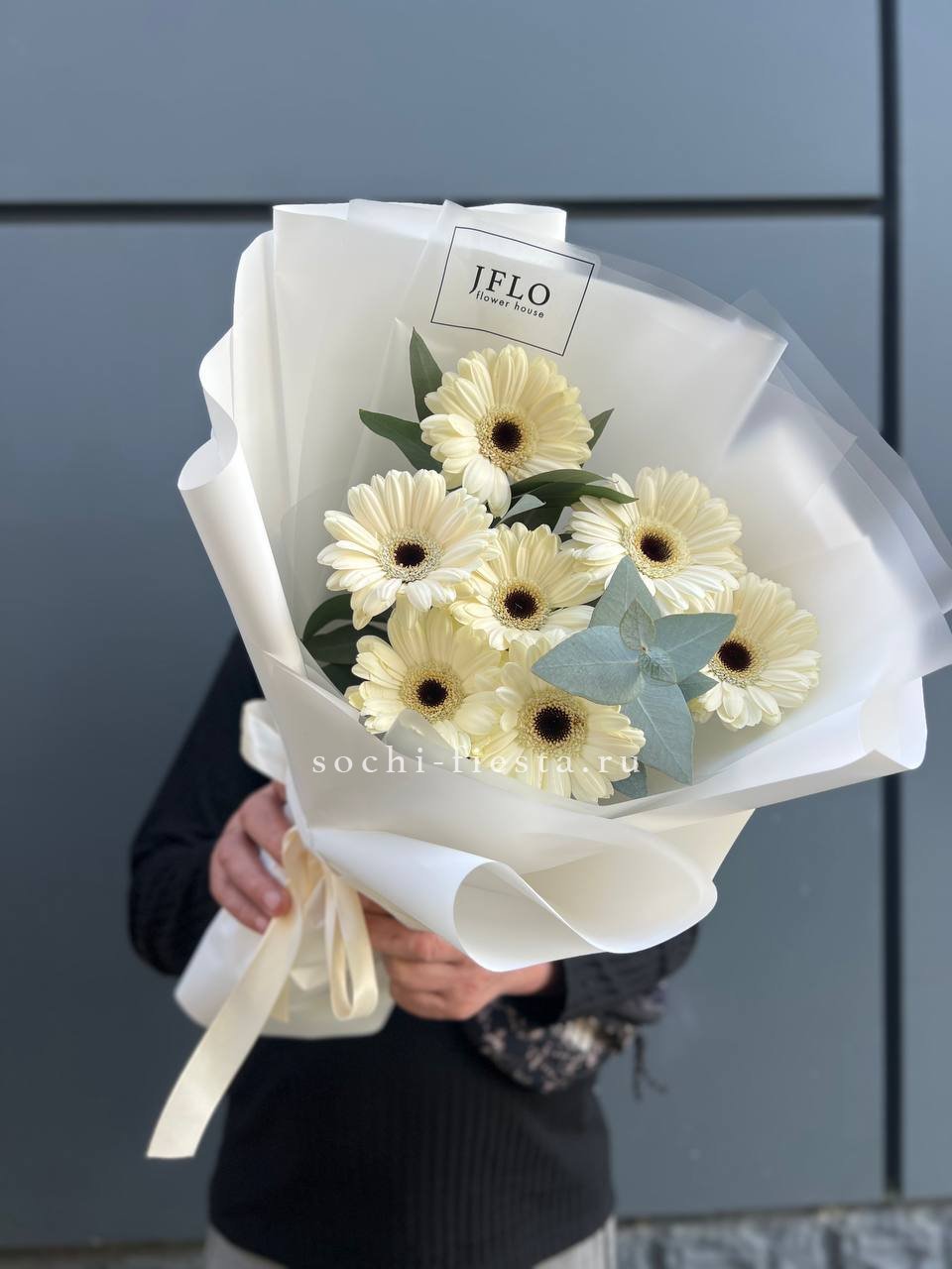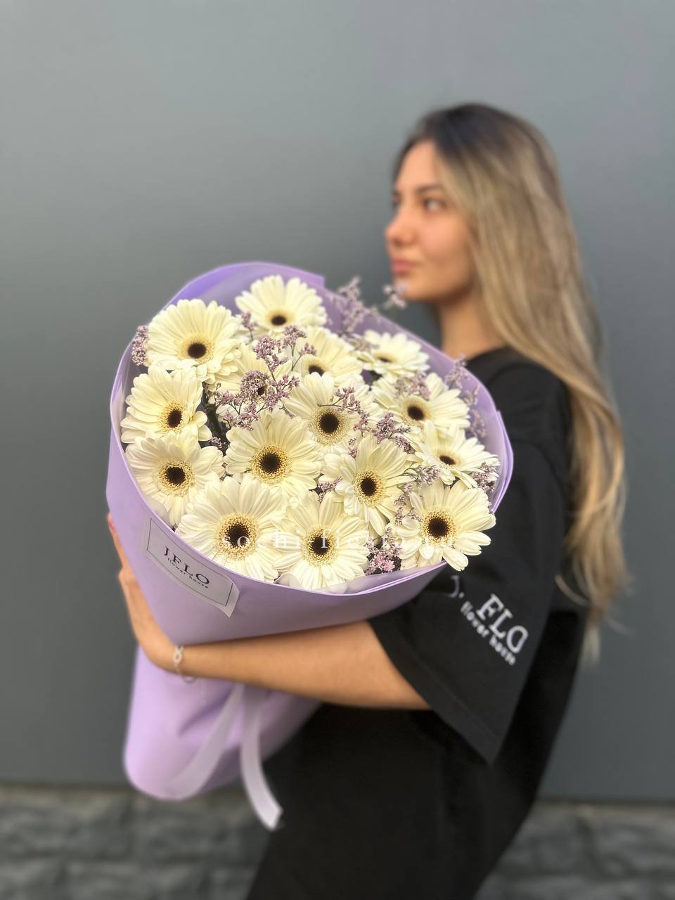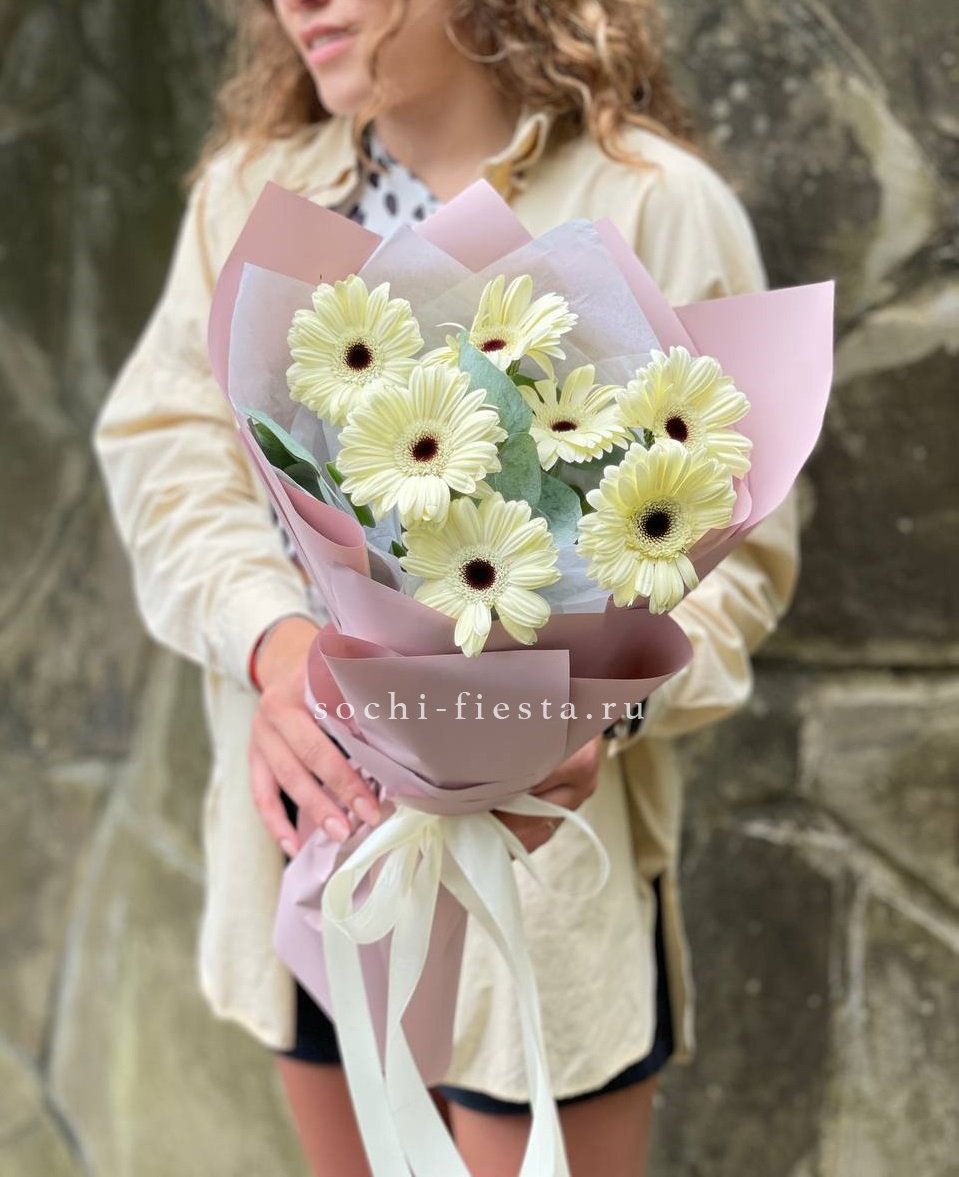 Герберы раскрываются широкими головками и складываются в яркую охапку с открытой подачей. Цветные лепестки располагаются на одной высоте и образуют ритмичный рисунок.
