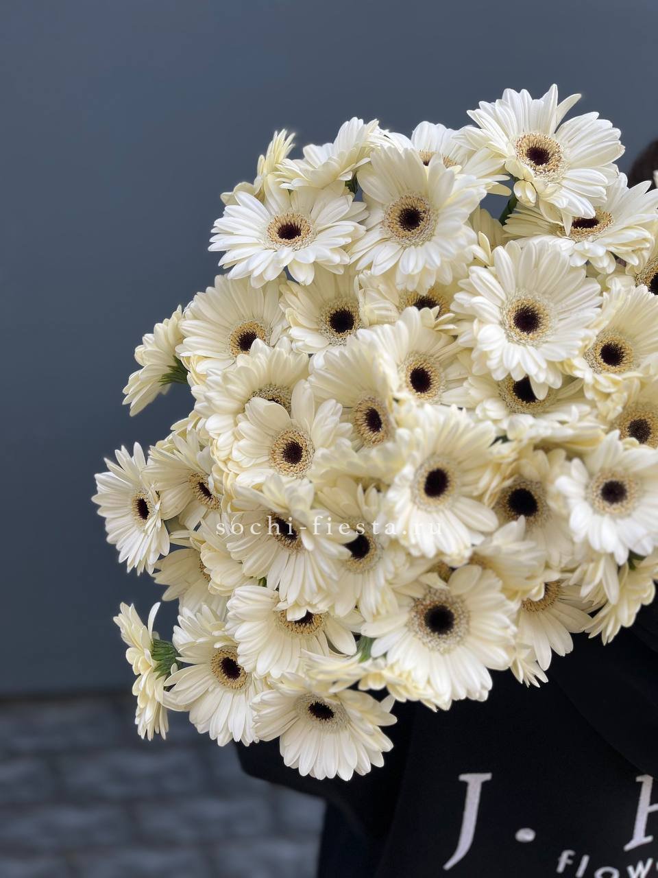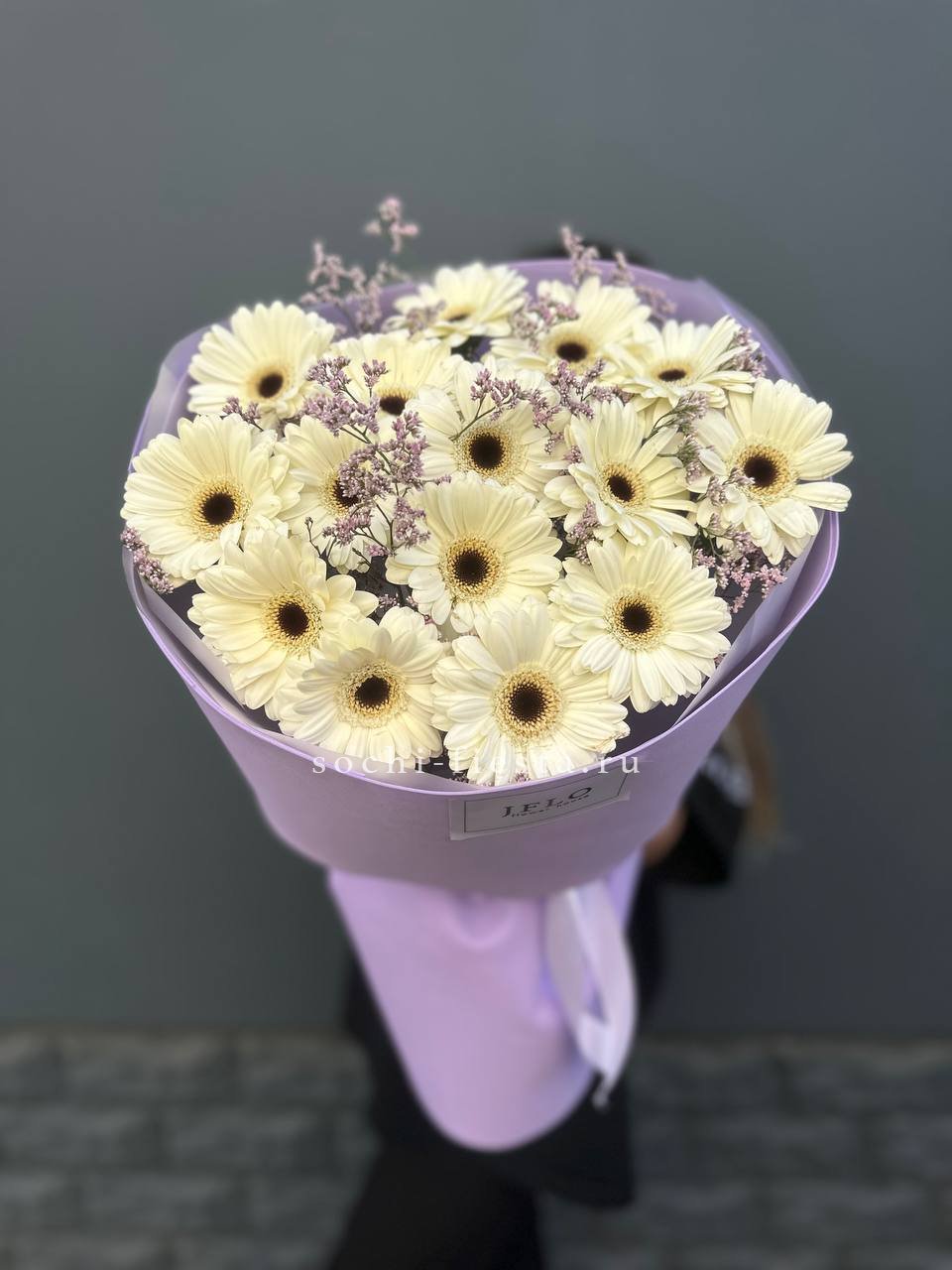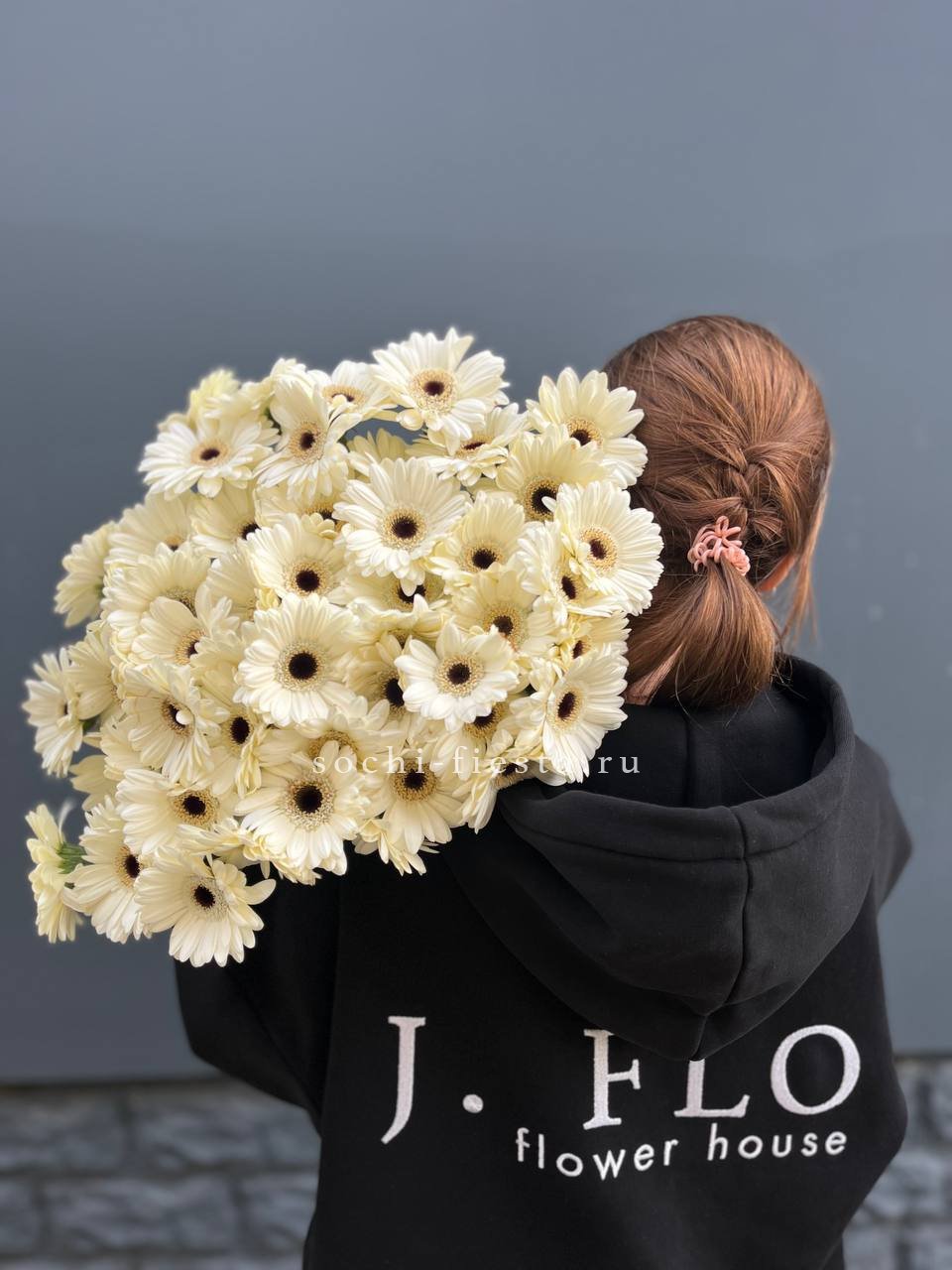 Герберы раскрываются широкими головками и складываются в яркую охапку с открытой подачей. Цветные лепестки располагаются на одной высоте и образуют ритмичный рисунок.