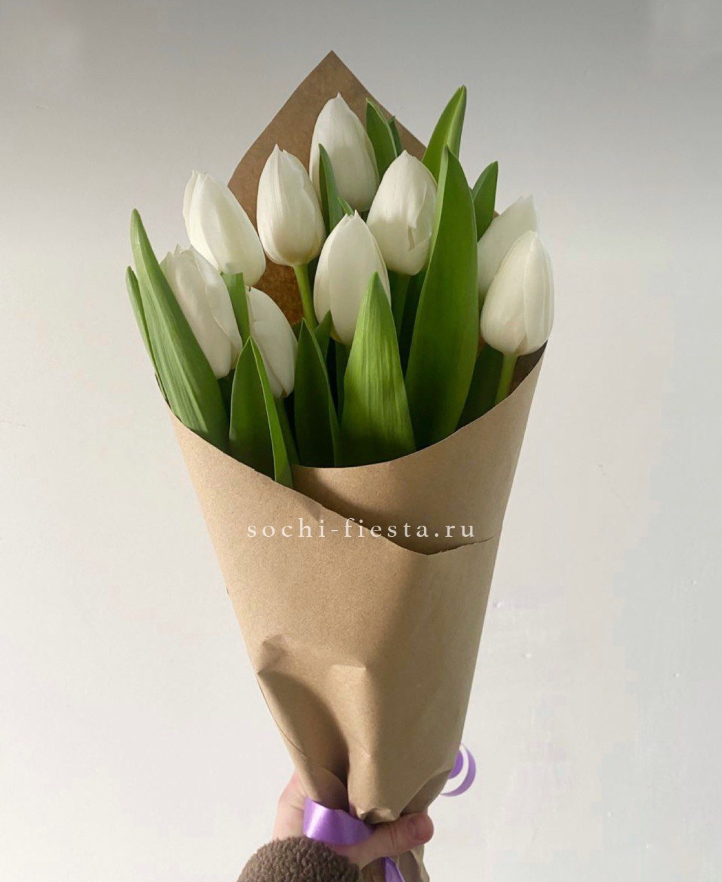 9 белых тюльпанов, лента, крафт, вспомогательное оформление.