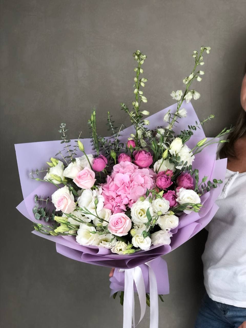 гортензия, диантус, мисти бабблс, астильба или аналог, гербера, кустовая роза, бовардия, эустома, эвкалипт, авторская упаковка, лента.