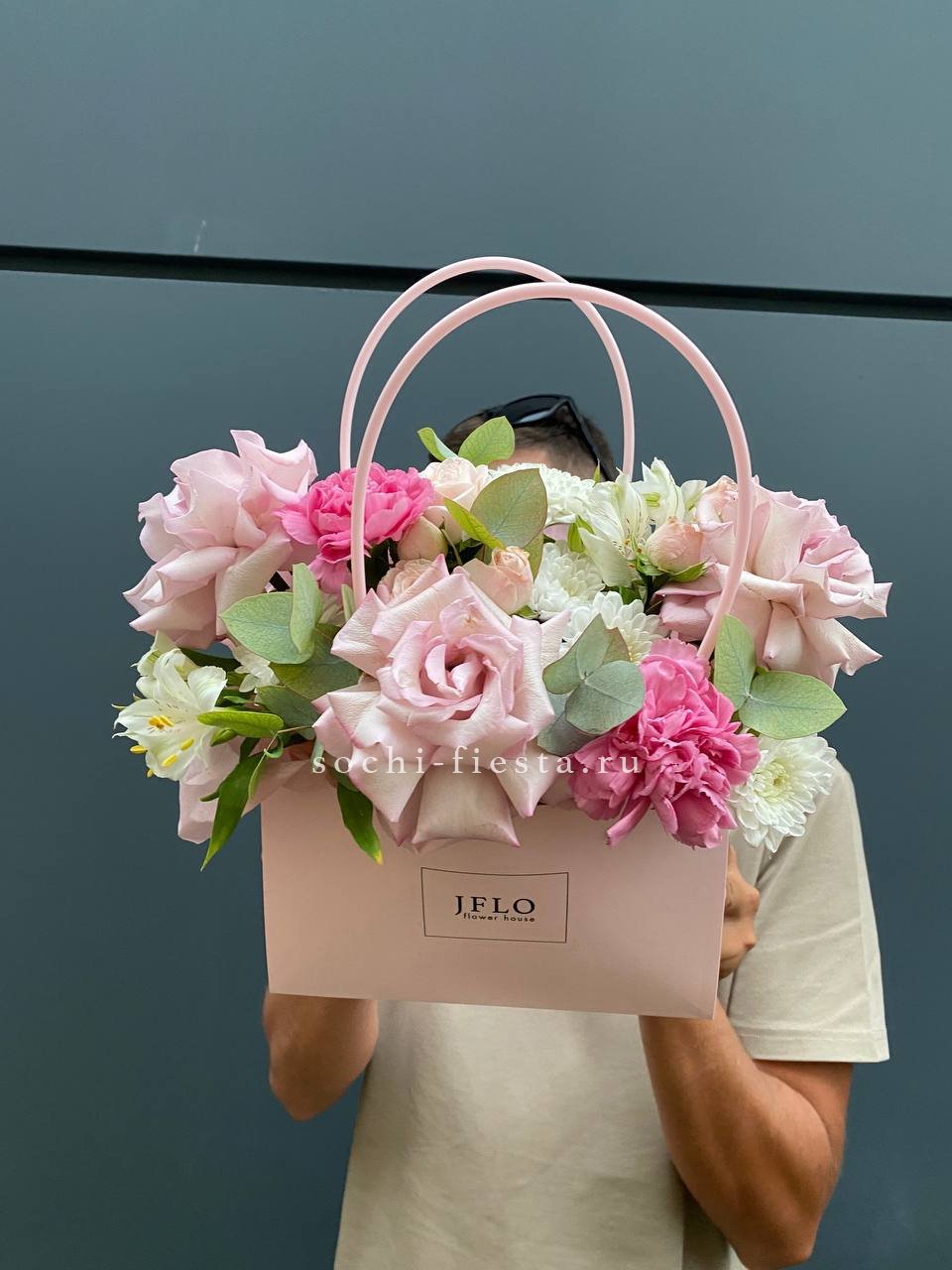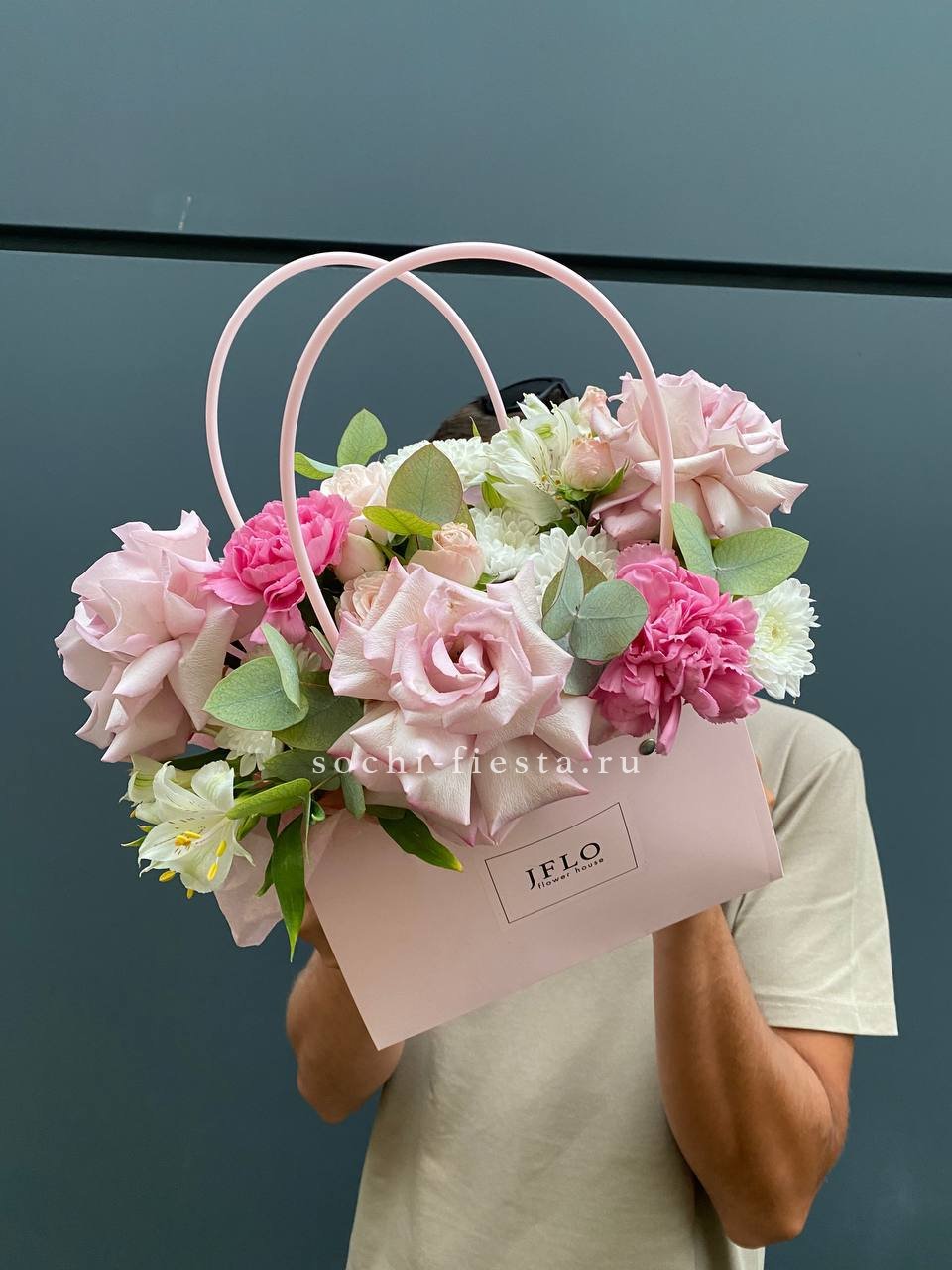 розовая и белая розы, пионовидная роза, кустовые розы, эвкалипт, лента, сумка.