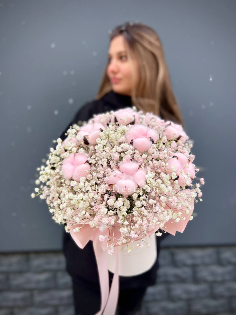 Радужные гипсофилы рассыпаются облаком вокруг хлопковых коробочек. Лёгкая воздушная масса создаёт ощущение утреннего сада после дождя.
