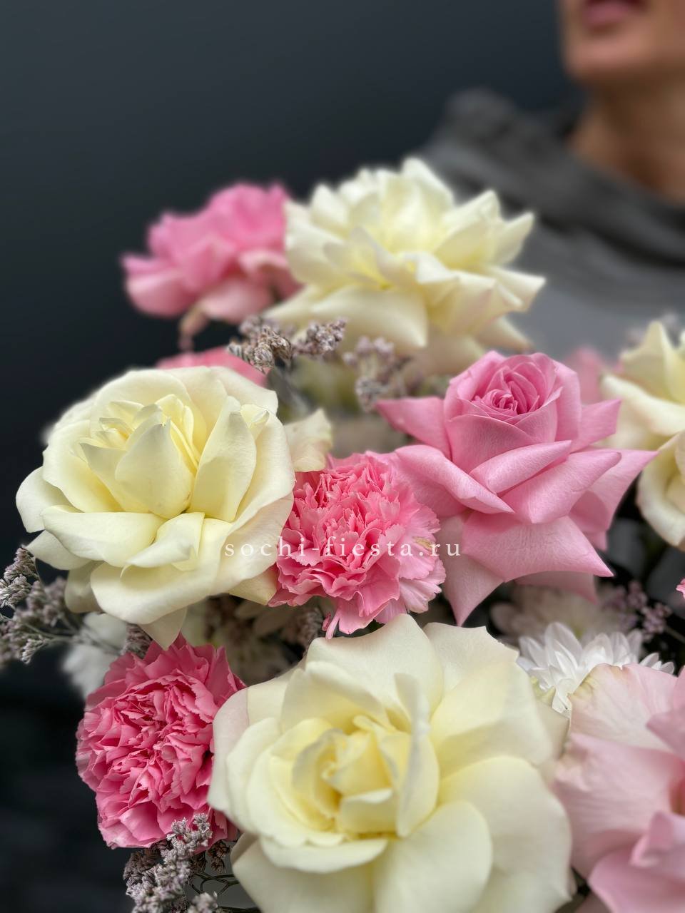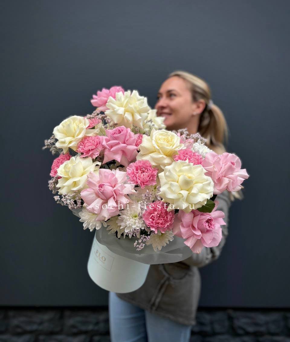 Для заказа товара "Коробка французских роз и диантусов "Бони"" с доставкой в Красноярске нажмите в корзину