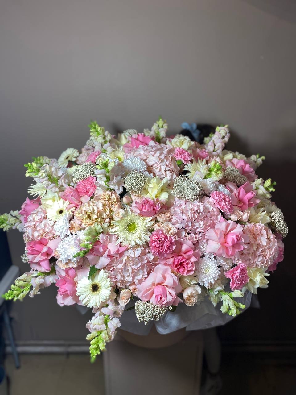хризантемы, герберы, розы, антиринум, диантус, гортензия, бомбастик, озатамус в коробке или корзине на выбор.