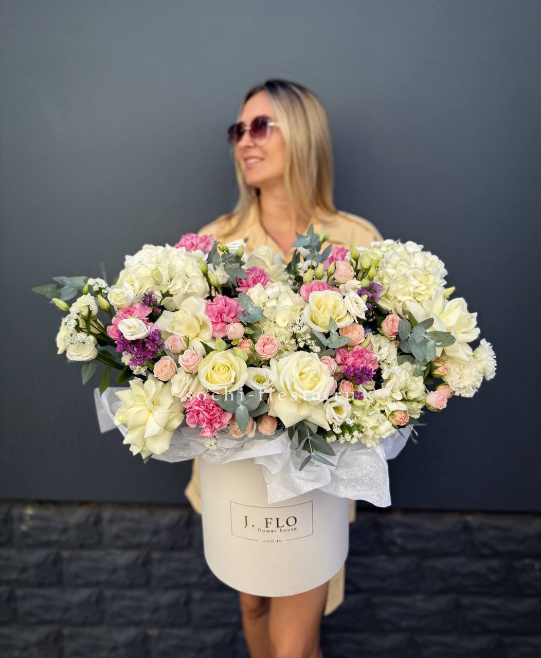 Белоснежные розы и воздушная эустома соседствуют с пышной гортензией и яркими вспышками статицы. Композиция собрана плотно, каждый цветок находит своё место в общем ритме.