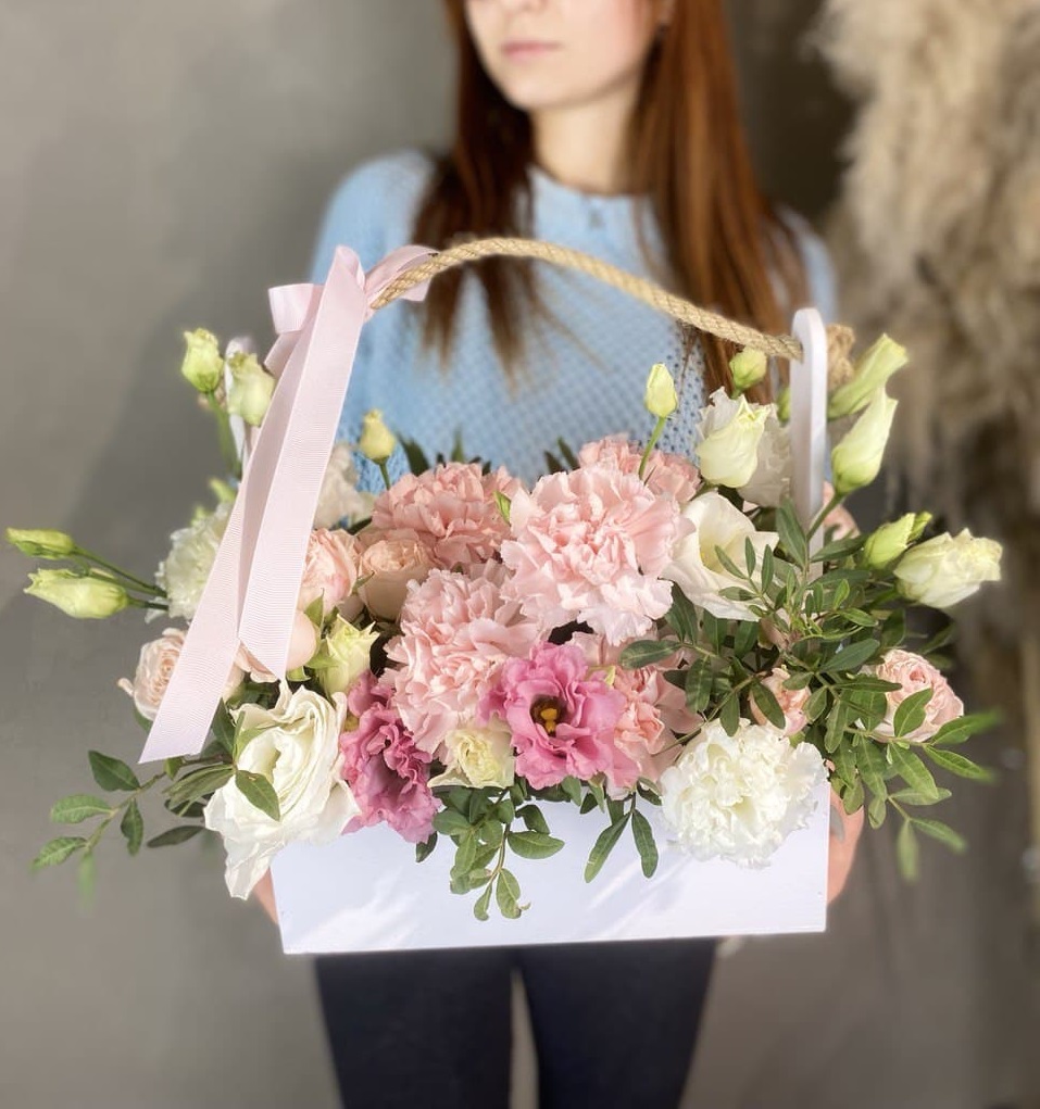 Деревянный ящик собрал в себе плотные бутоны кустовых роз, воздушную эустому и пышные соцветия гортензии. Зелень фисташки добавляет объём и завершает форму композиции.