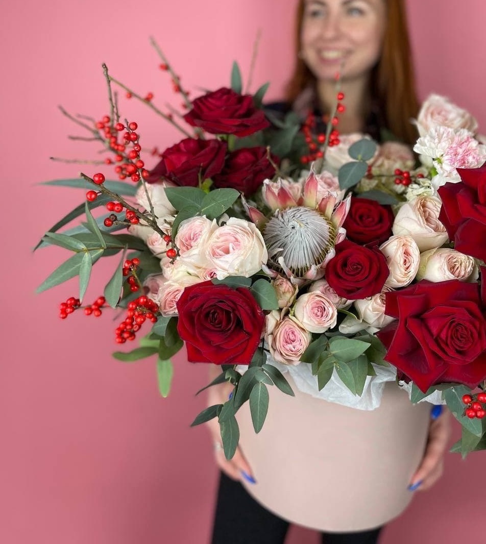 Объемные головки пионовидных роз сплетаются с фактурной протеей и ягодами илекса. Композиция наполняет пространство цветом и создает ощущение живого сада в боксе.