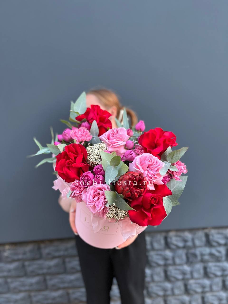 красная и розовая роза, озатамус, диантус, мисти баблс, эвкалипт, бокс 20.
