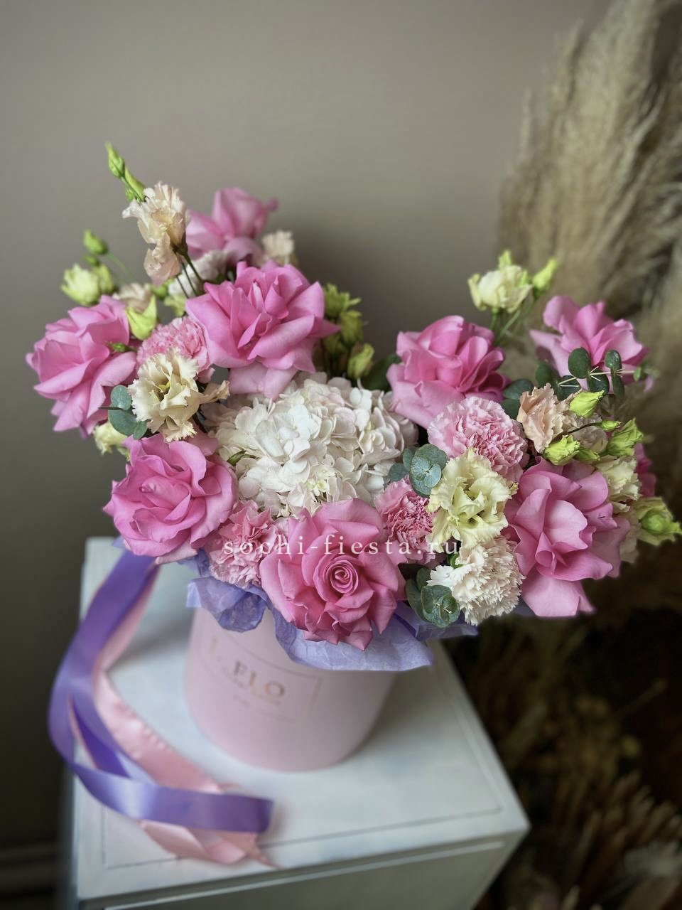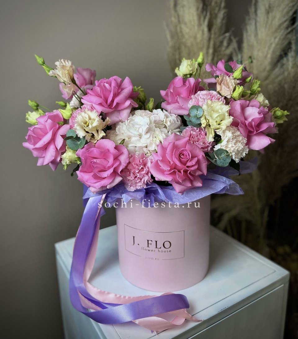 цветочная композиция в розово-белых тонах в розовом цилиндре D20-25.