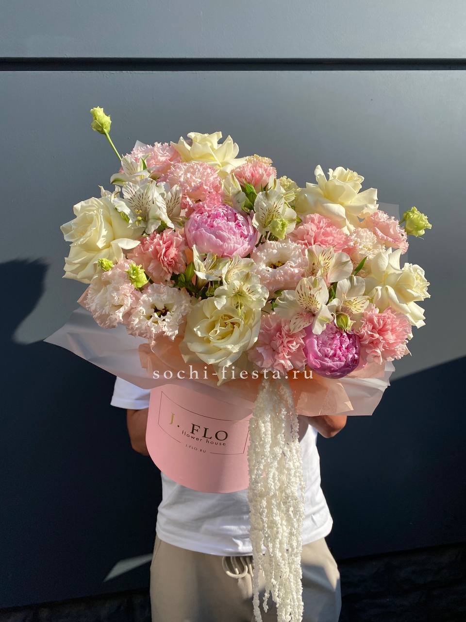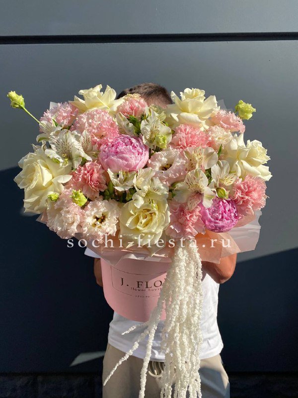 пионы, розы, эустома, диантусы, альстромерия, амарант, цилиндр D20, эвкалипт, лента, упаковка.