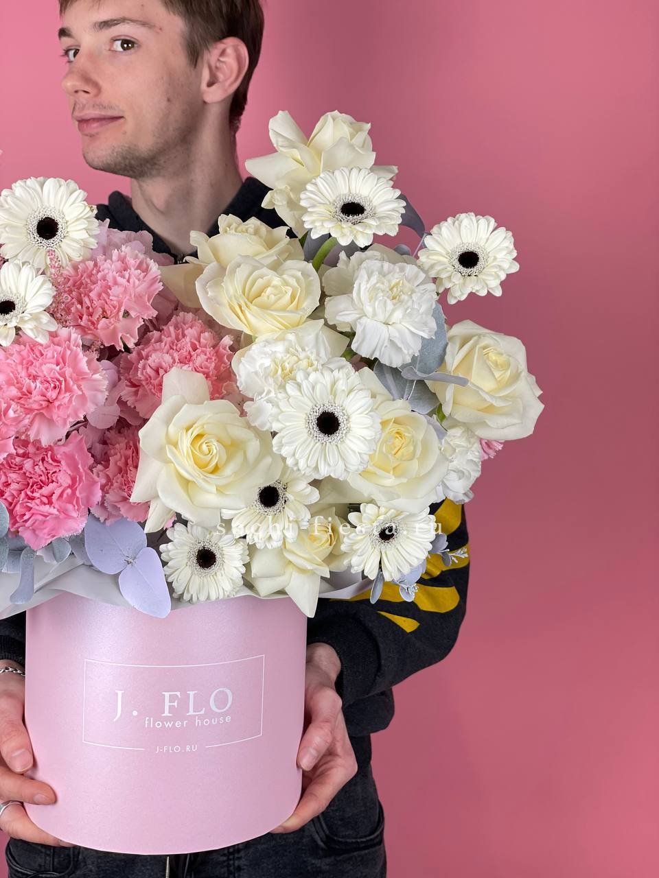 Белоснежные розы и герберы выстраивают чистую цветовую гамму с яркими акцентами диантусов. Эвкалипт вносит графичность и природную фактуру в общую композицию.