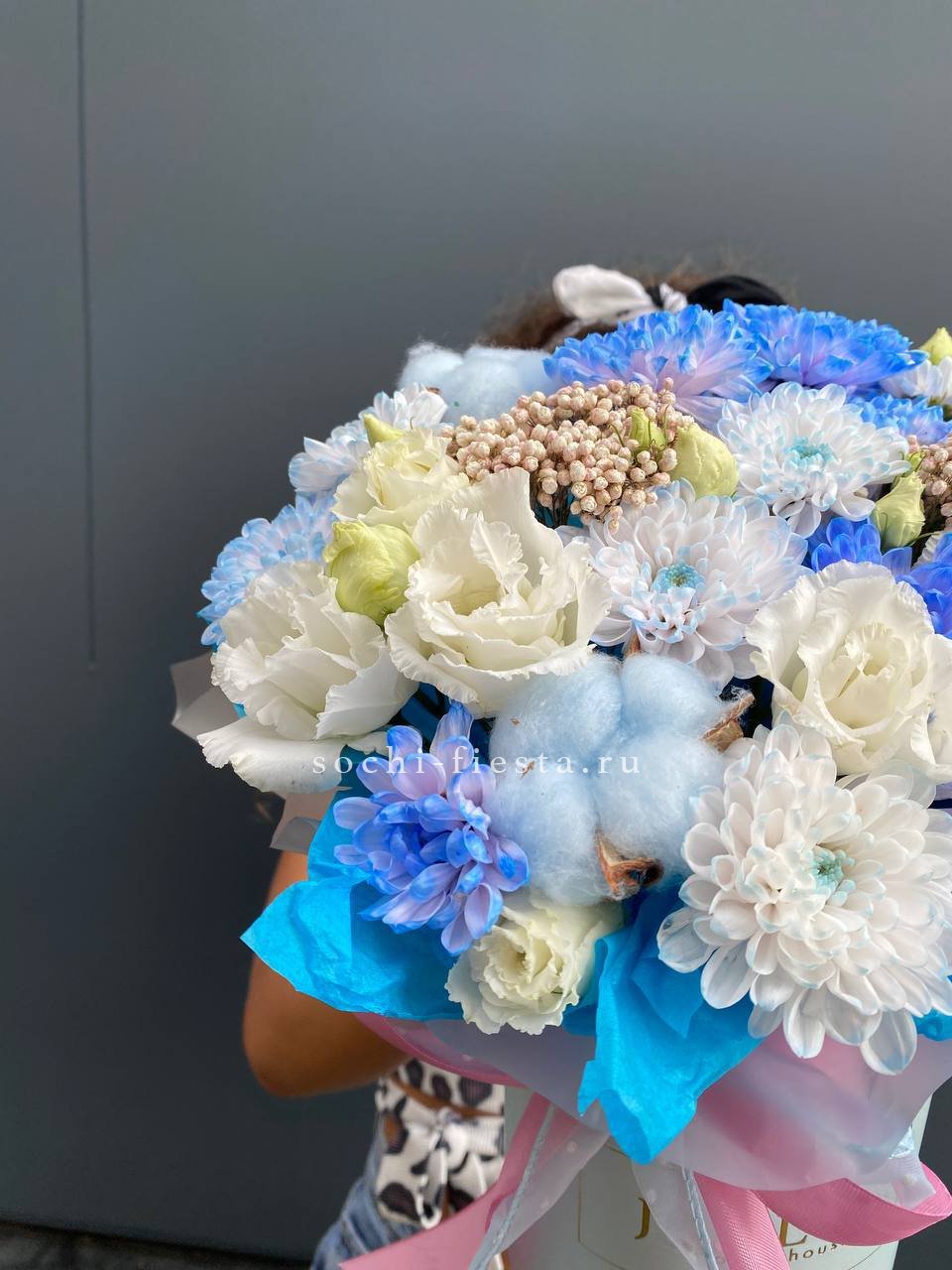 Кустовые хризантемы и эустома с хлопком формируют лёгкую воздушную массу. Озотамус поддерживает природную фактуру. Композиция долго сохраняет свежий вид и не требует сложного ухода.