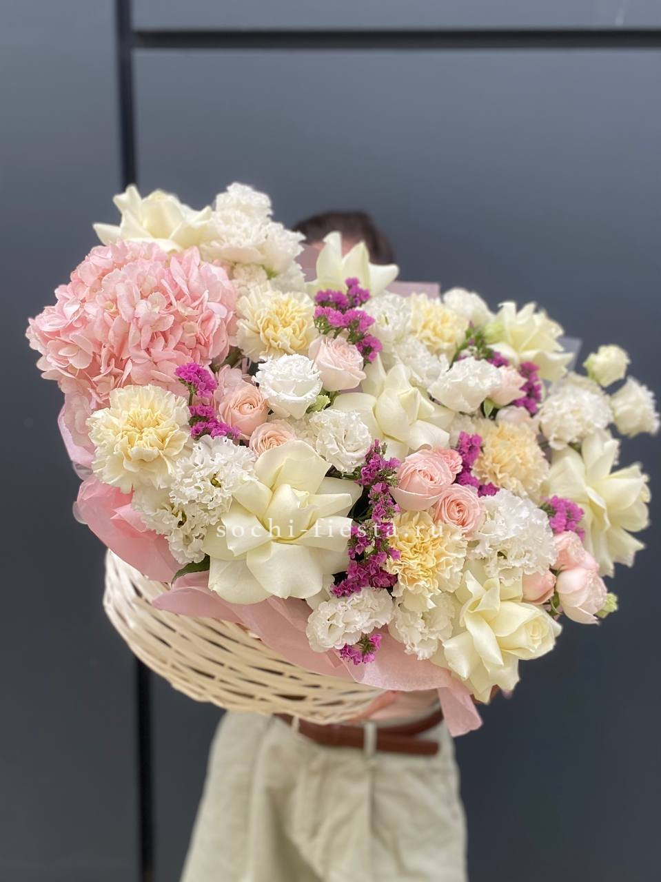 гортензия, эустома, диантус, роза, бомбастик, статица или аналог, корзина.
