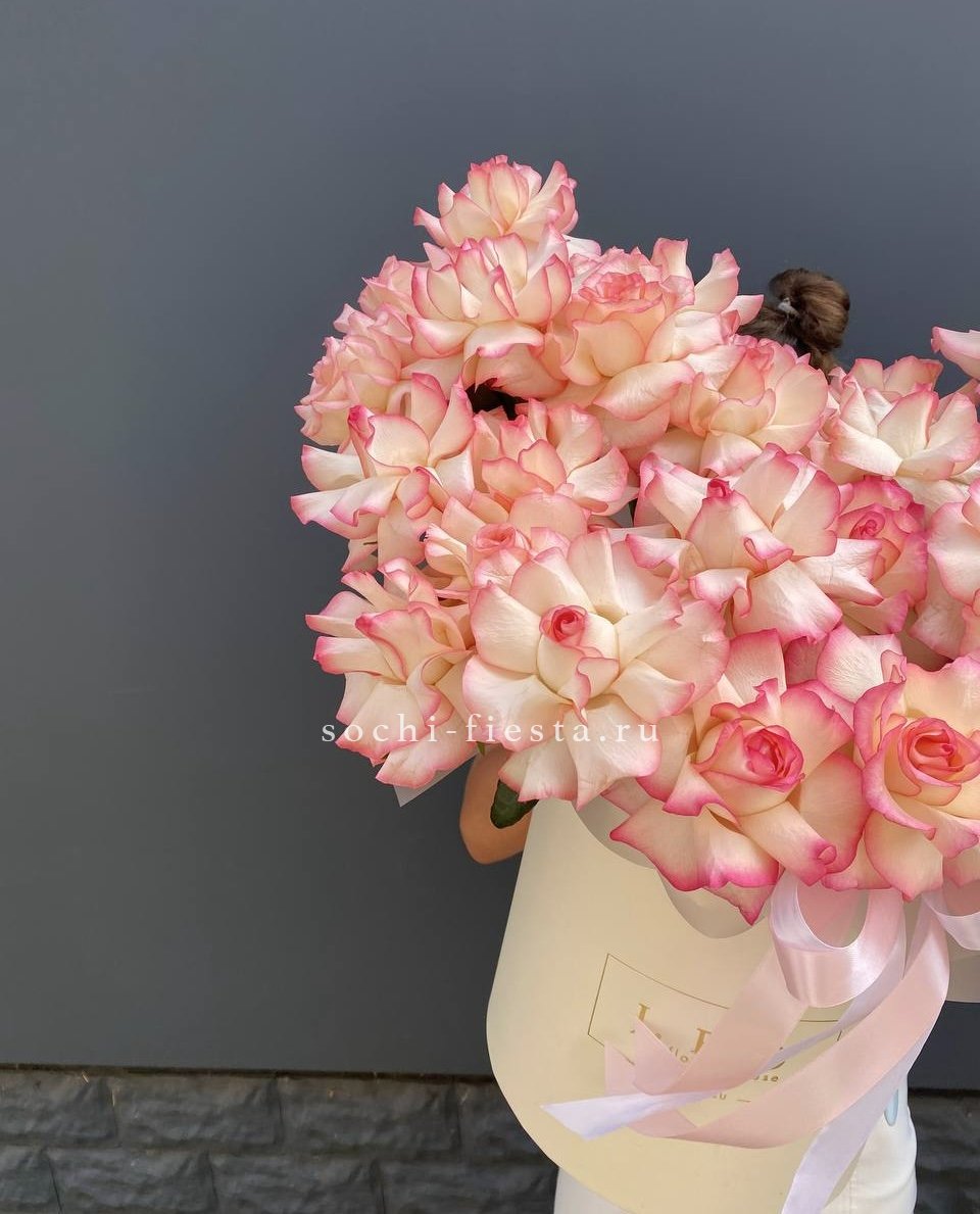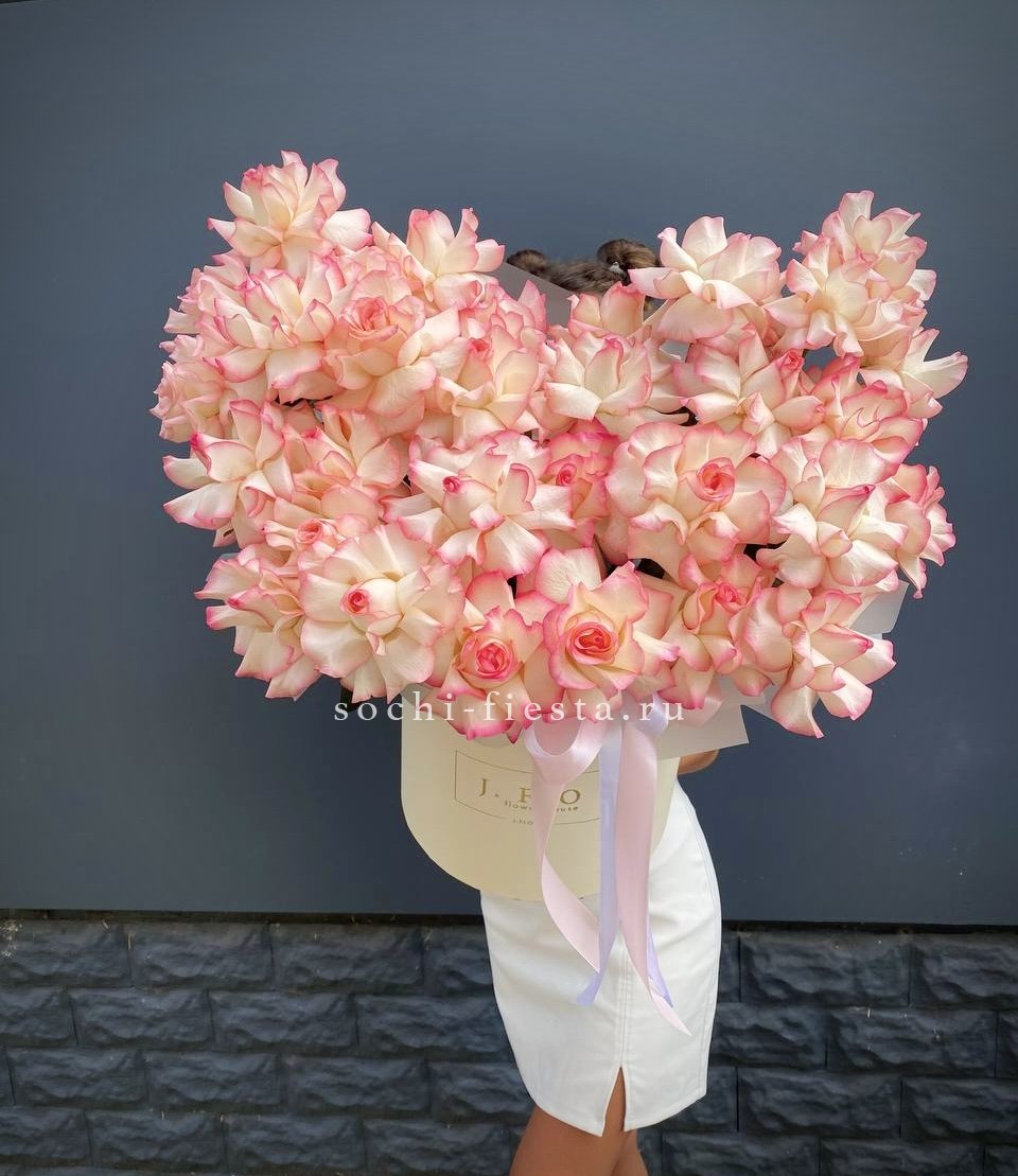 Корзина вмещает двести один бутон, образующих пышное цветочное полотно. Классическая форма подачи позволяет разместить композицию в любом пространстве без необходимости искать вазу. Впечатляющий объем для важных событий.