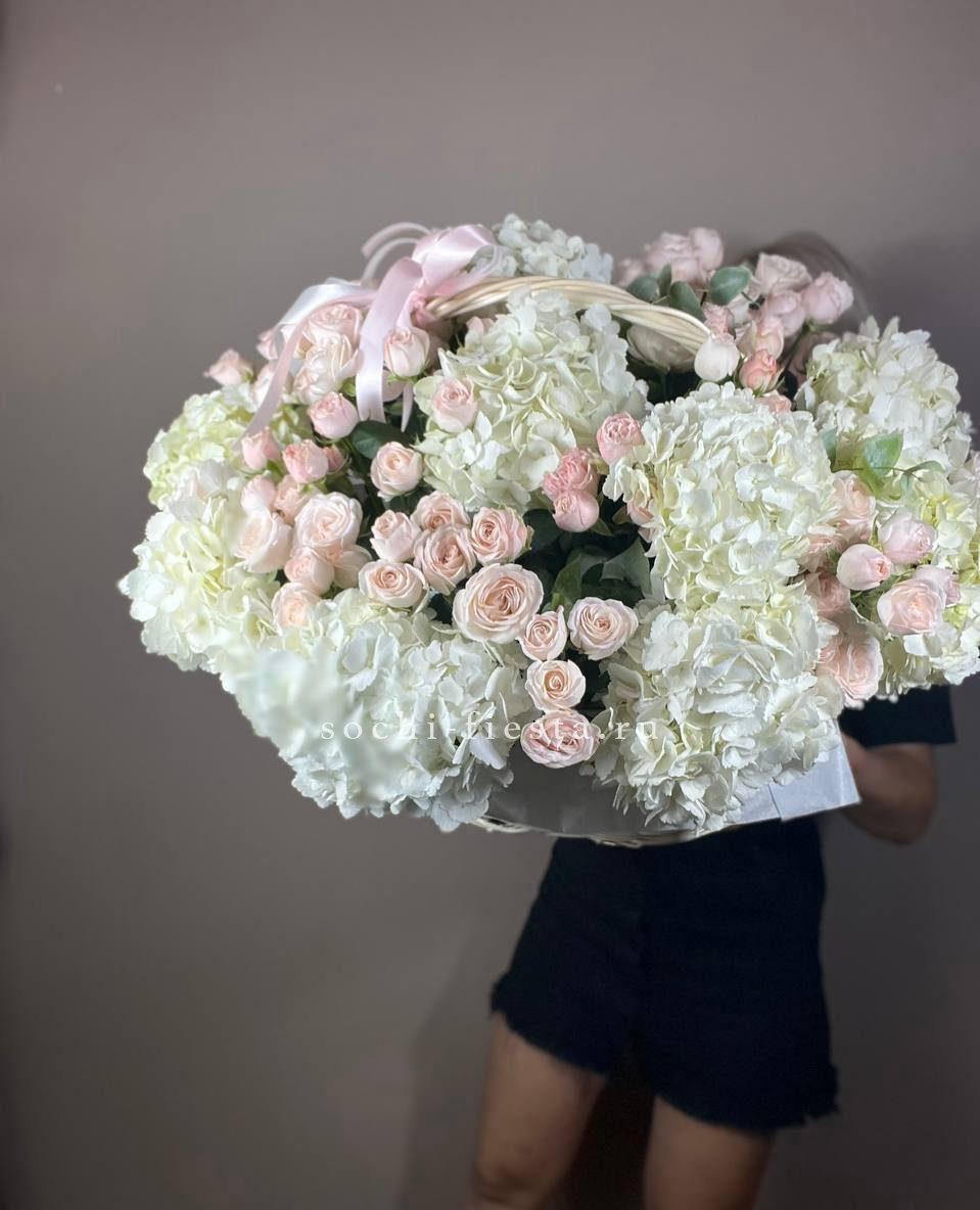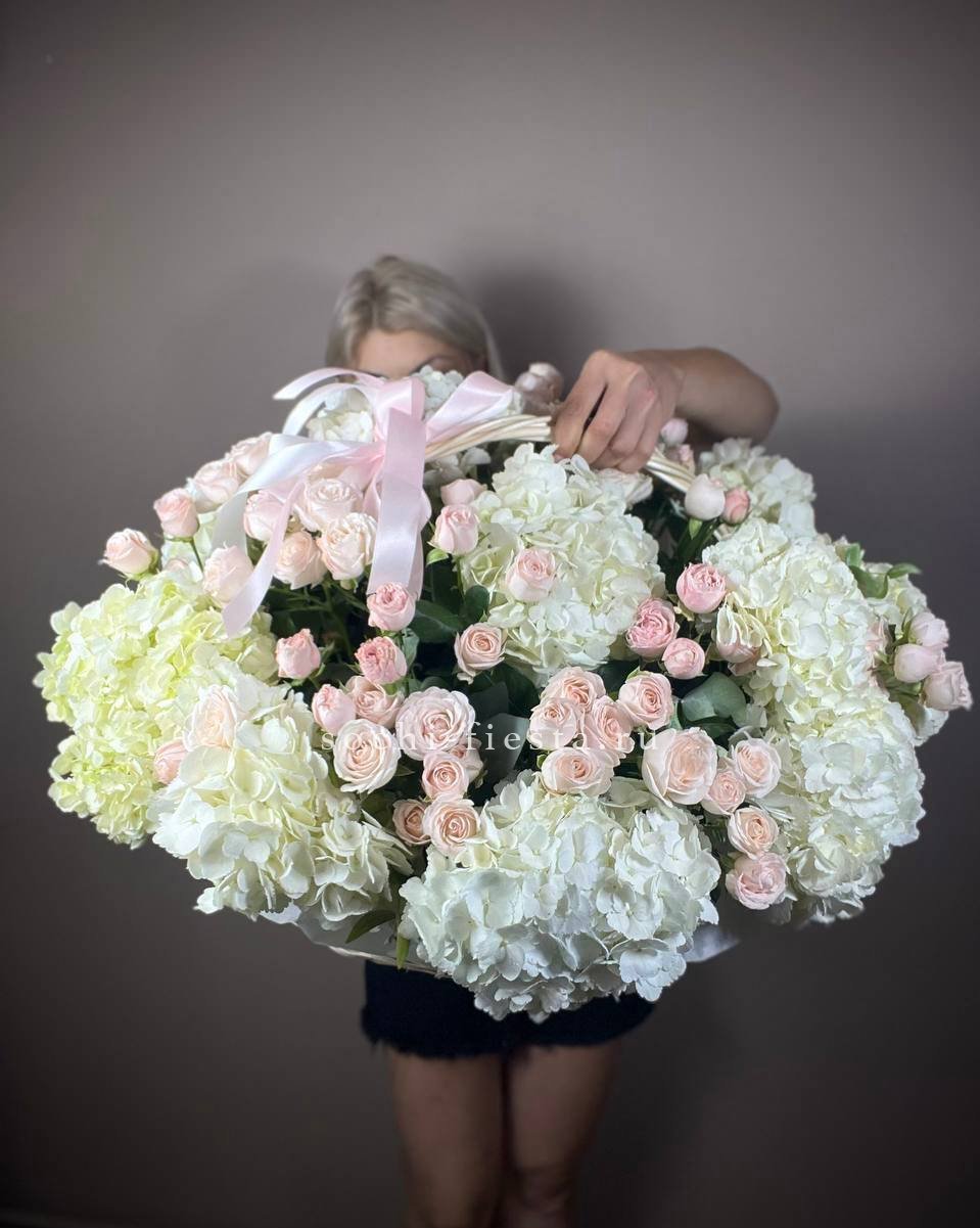 гербера, гортензия, диантус, хайди, эустома, эвкалипт, корзина средняя.