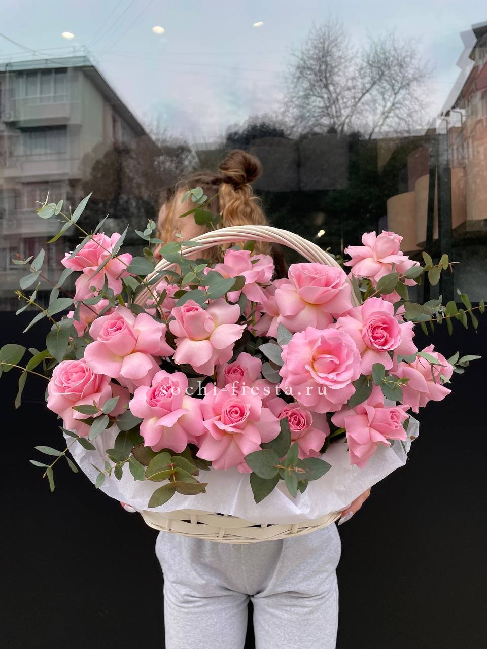 Гортензия и эустома задают объём, а яркие герберы расставляют цветовые акценты по всей композиции. Диантус и хайди добавляют воздушности, эвкалипт завершает силуэт мягкими линиями. Корзина держит форму и создаёт устойчивую основу для пышной композиции.