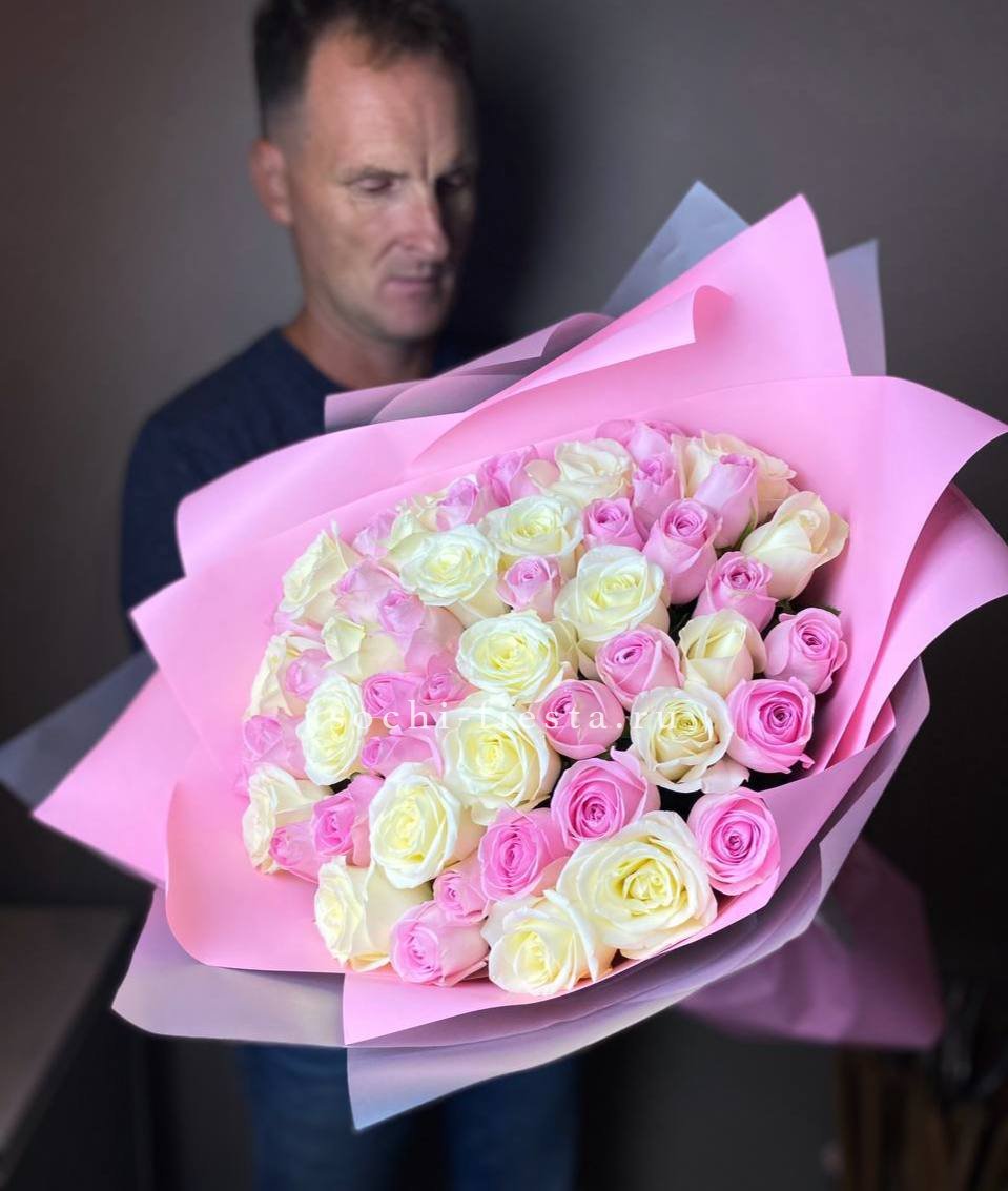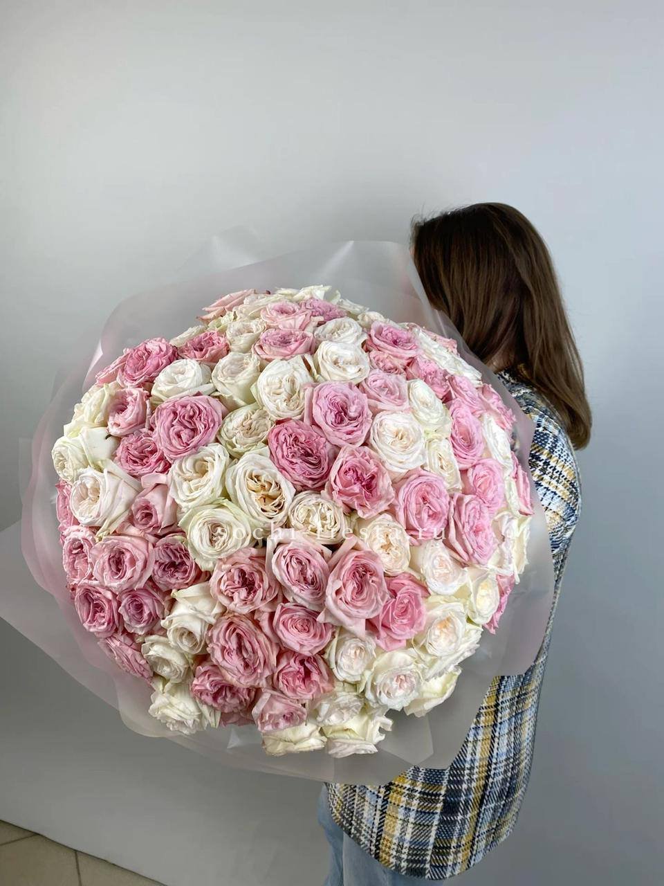 Сто один бутон в бело-розовой палитре создают объёмное облако цвета. Композиция впечатляет масштабом и наполняет пространство мягким сиянием лепестков.