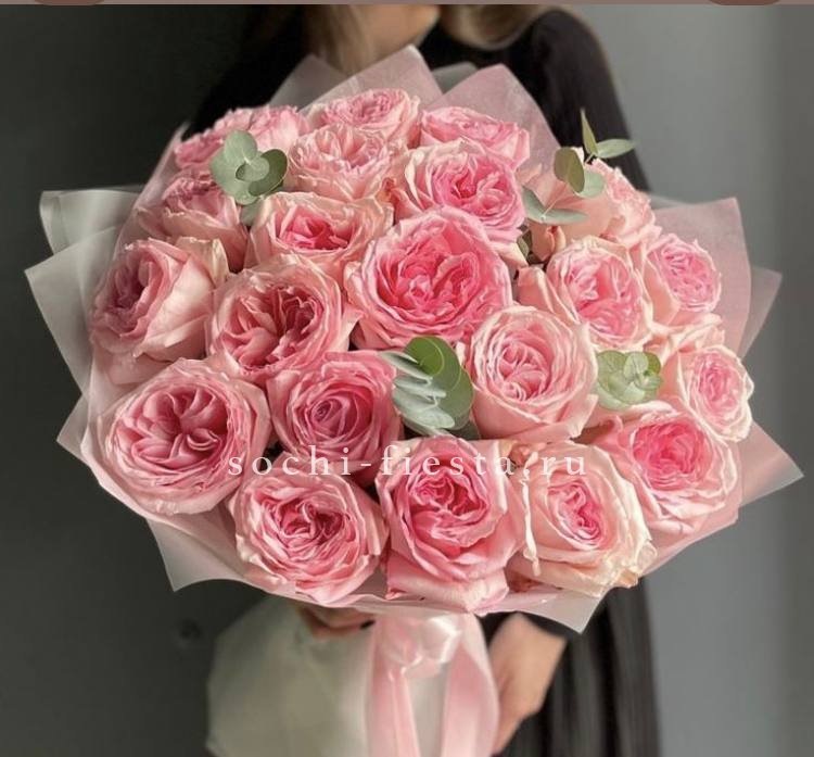 розы пионовидные 15 шт, эвкалипт, пленка, лента.