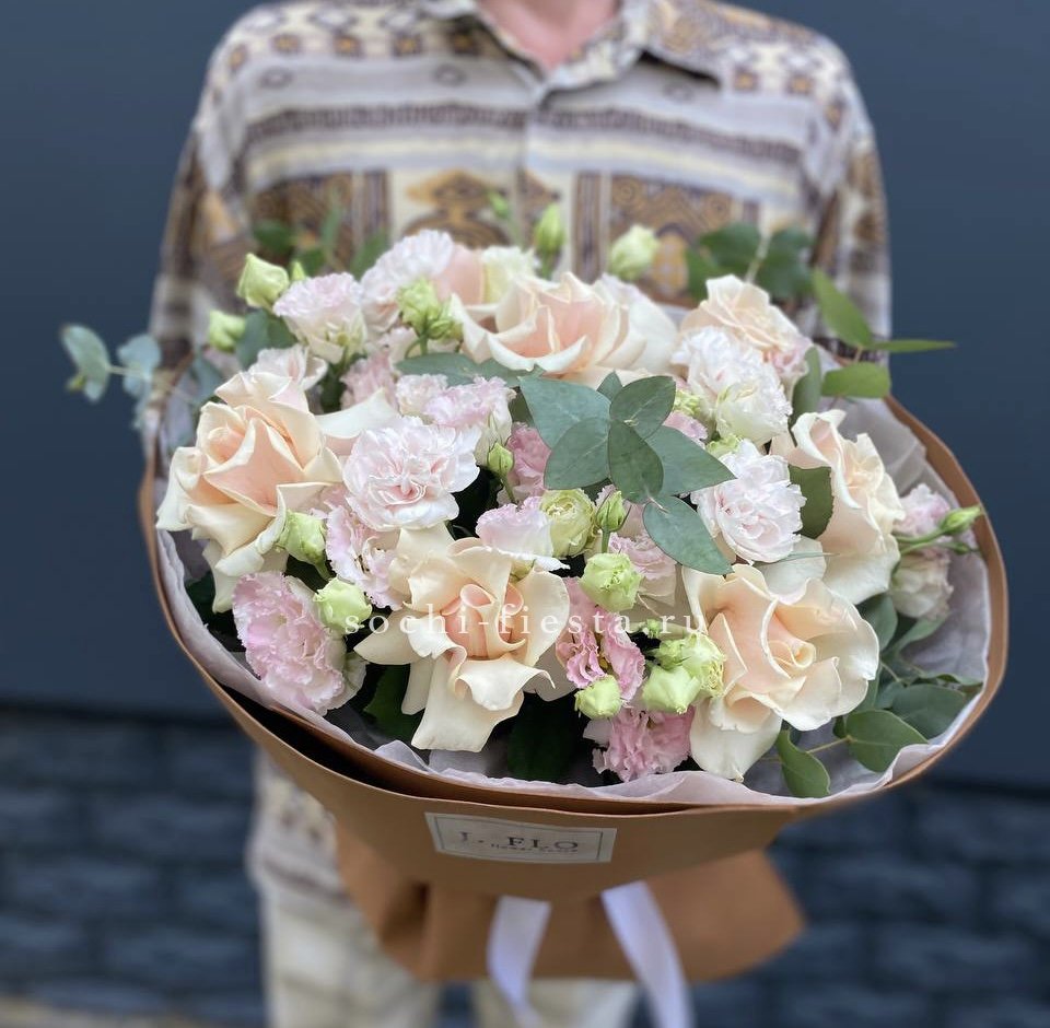 Кремовая палитра с лёгкими переходами в оттенках капучино создаёт спокойное и обволакивающее впечатление. Эустома и диантус добавляют воздушности, а эвкалипт завершает композицию мягкими зелёными нотами.