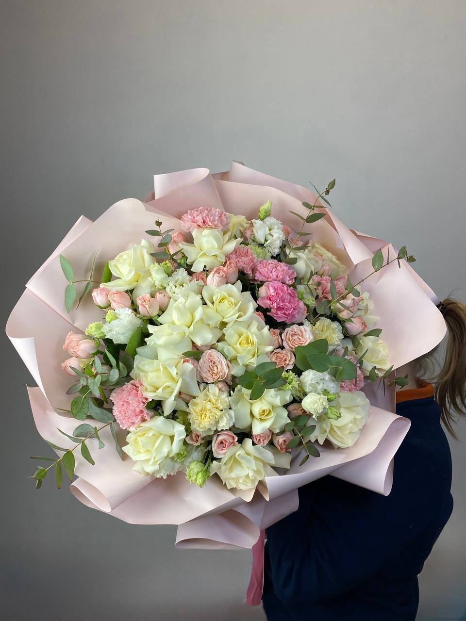 Кустовые розы и эустомы собраны в компактную форму с мягкими линиями. Сочетание нескольких оттенков создаёт живописный эффект без лишней пышности.