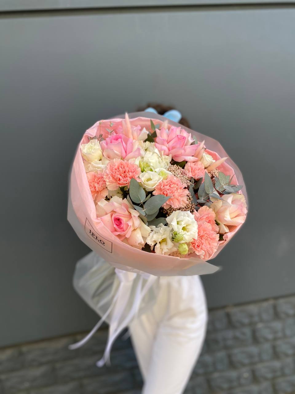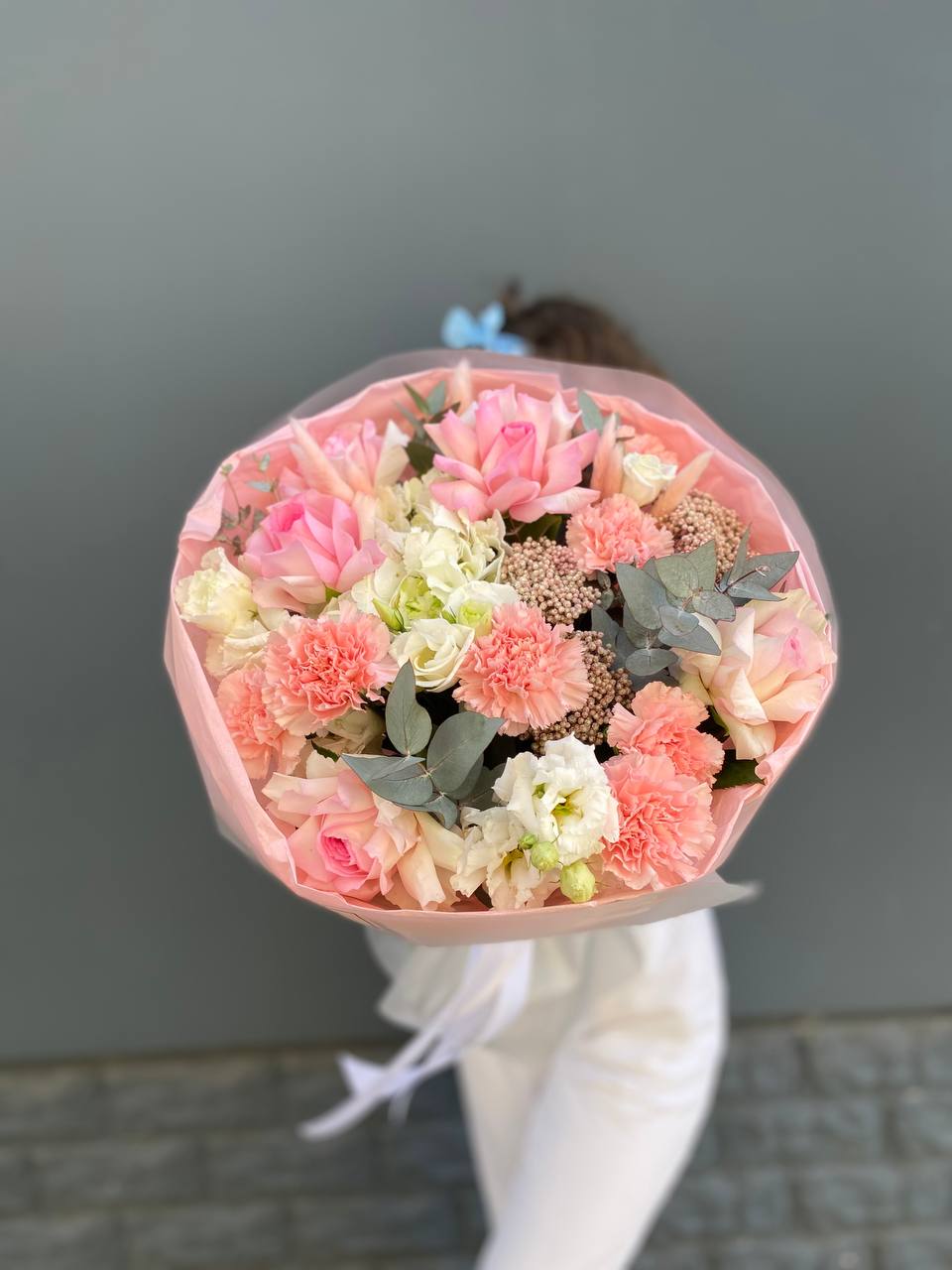 Диантусы и маттиола добавляют букету душистую лёгкость, а гортензия создаёт объёмную основу. Мисти баблс и эвкалипт рисуют воздушный контур вокруг розовых оттенков.