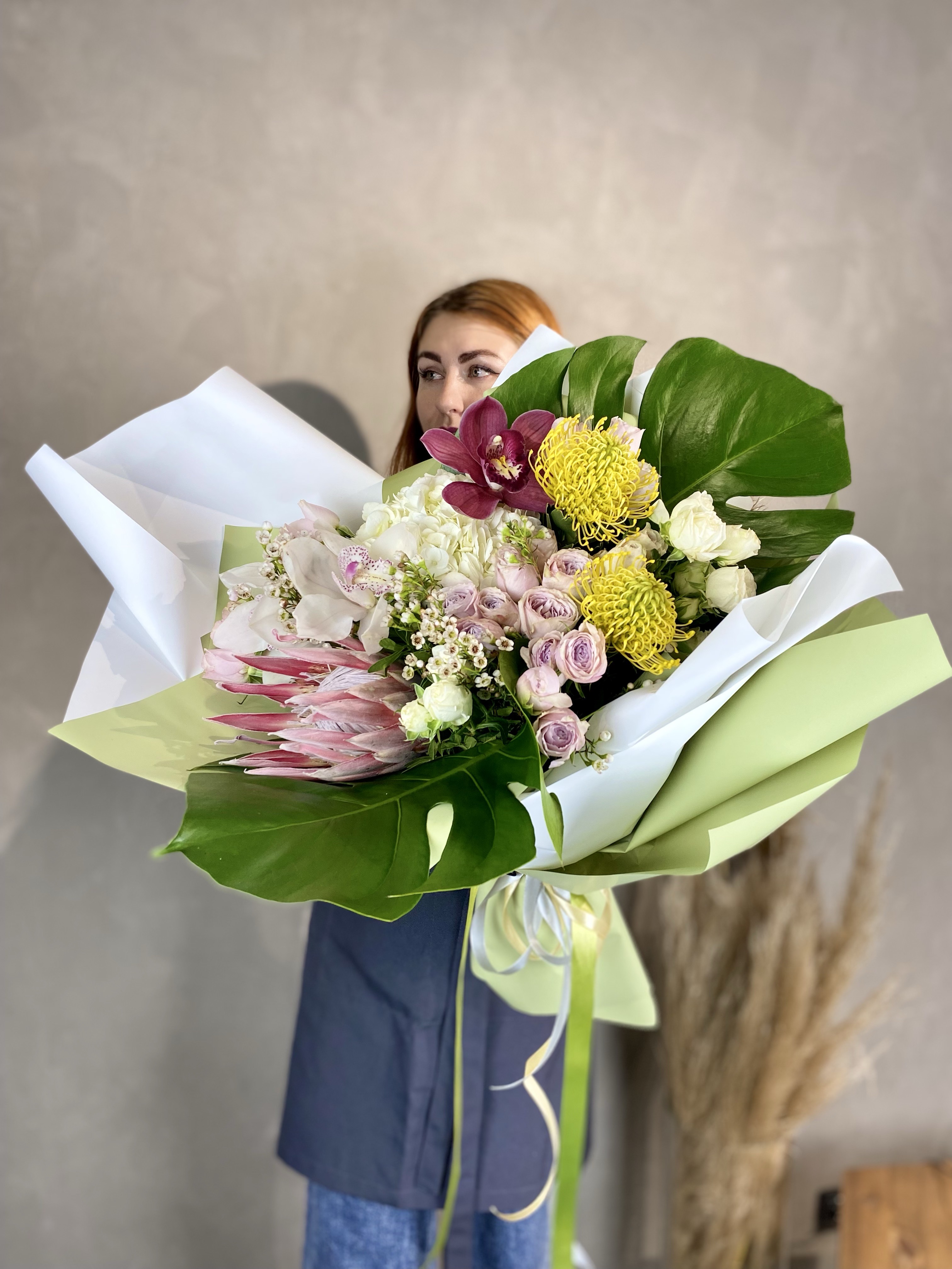 Протея и орхидеи задают графичный ритм, а пионовидные розы добавляют объём и мягкость линий. Гортензия создаёт плотную базу, на фоне которой каждый экзотический бутон читается ярче.