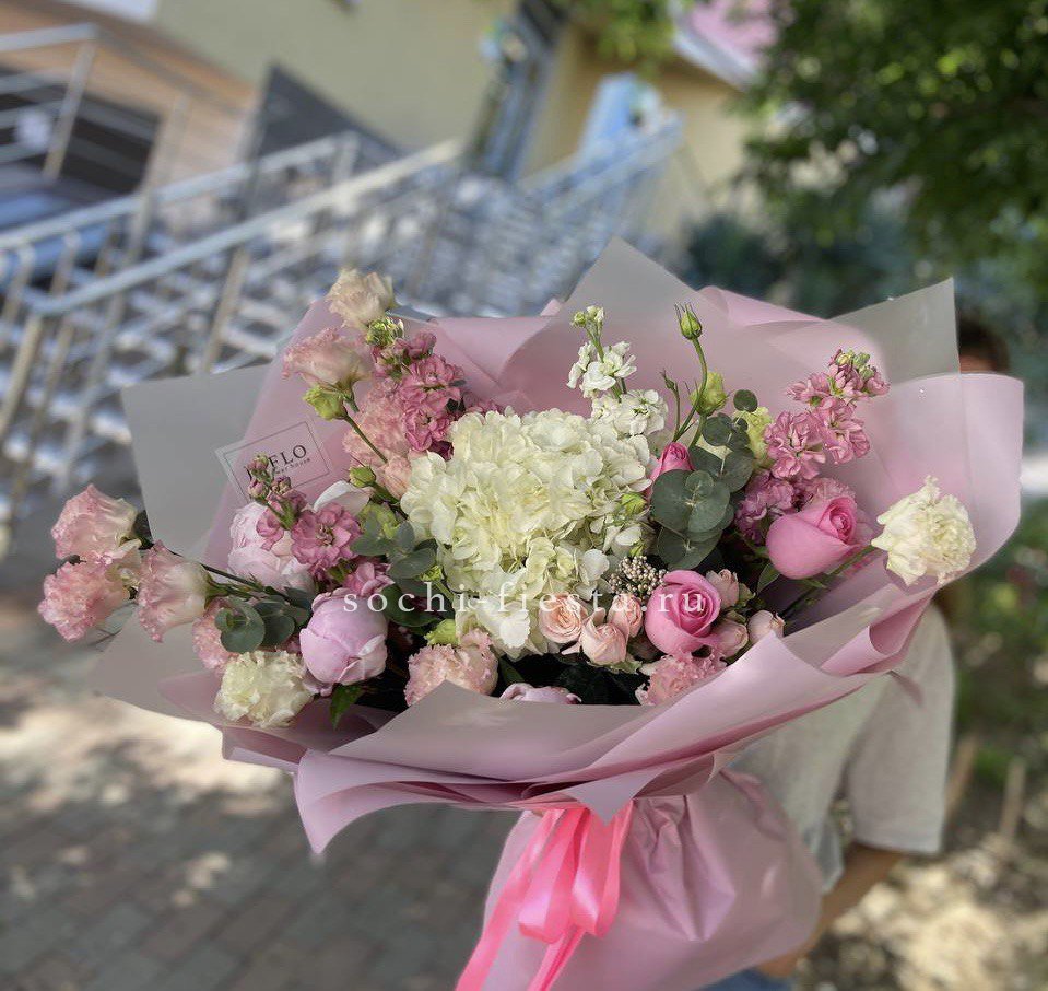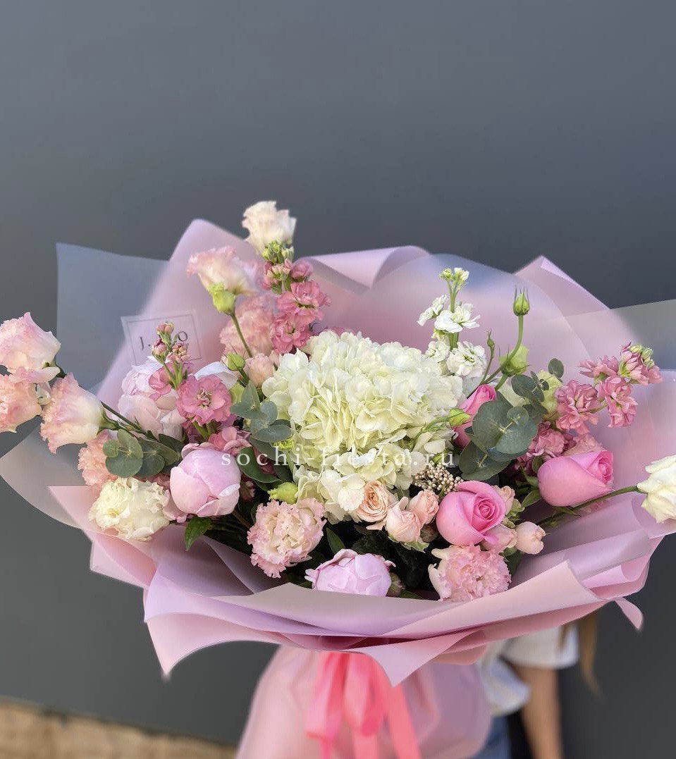 Пышная композиция в розово-персиковой гамме с объемными бутонами пионов и соцветиями гортензии. Маттиола добавляет воздушность, а дизайнерская упаковка завершает образ.