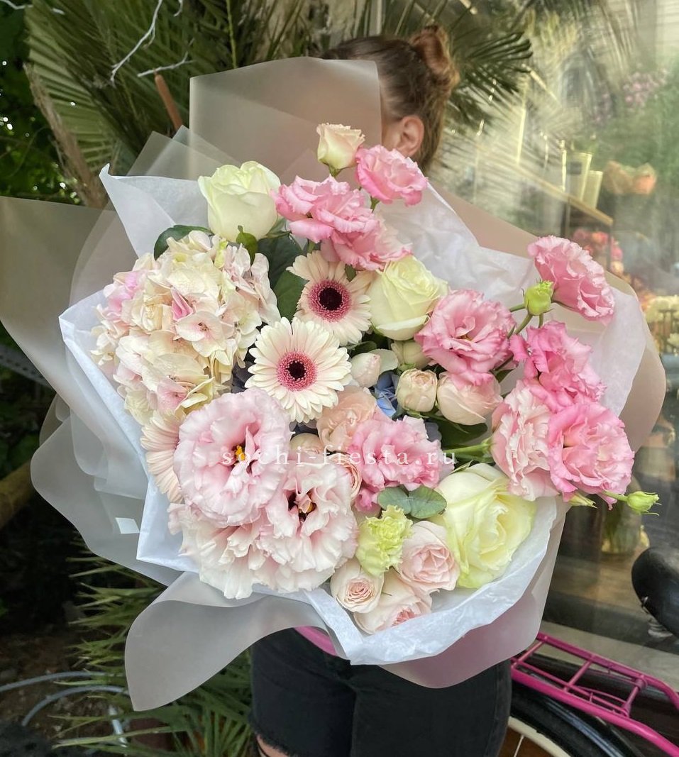 Светло-розовая палитра раскрывается от пудровых роз до свежих гербер. Бруния и аспарагус добавляют фактурные детали, а гортензия мягко завершает цветовую гамму.